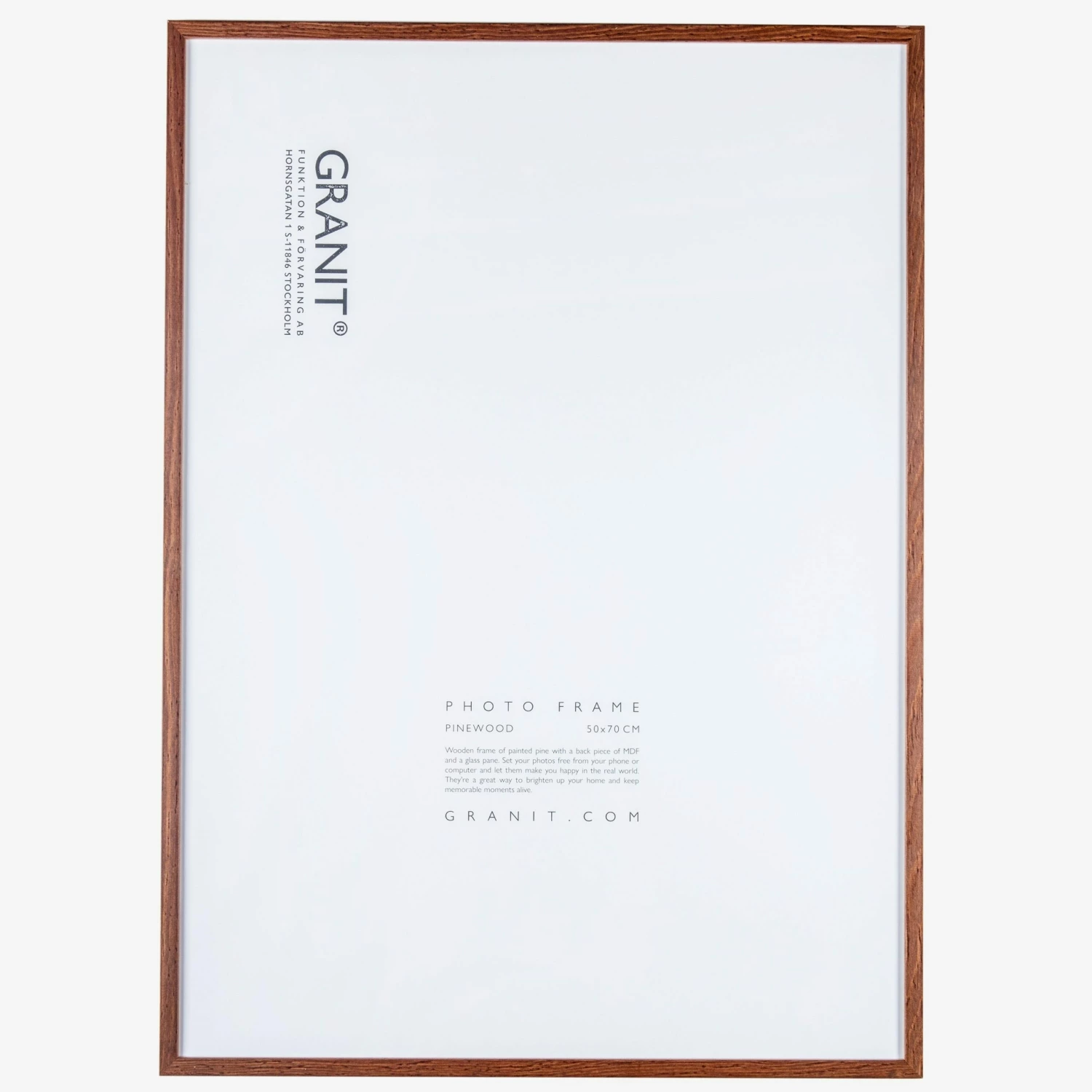 Holzrahmen aus gebeiztem Kiefernholz mit Glasscheibe. Der Nussbaumton verleiht dem Rahmen eine warme und gemütliche Ausstrahlung. Der Rahmen hat eine Mdf-Rückseite und ist in einer Reihe von Farben und Größen erhältlich, so dass du deine Bilder in verschiedenen Größen leicht aufeinander abstimmen kannst, um einen schönen, einheitlichen Effekt zu erzielen. Maße: 50 x 70 cm. Die Größe 50 x 70 cm ist die Fläche, die man im Inneren des Rahmens sieht.