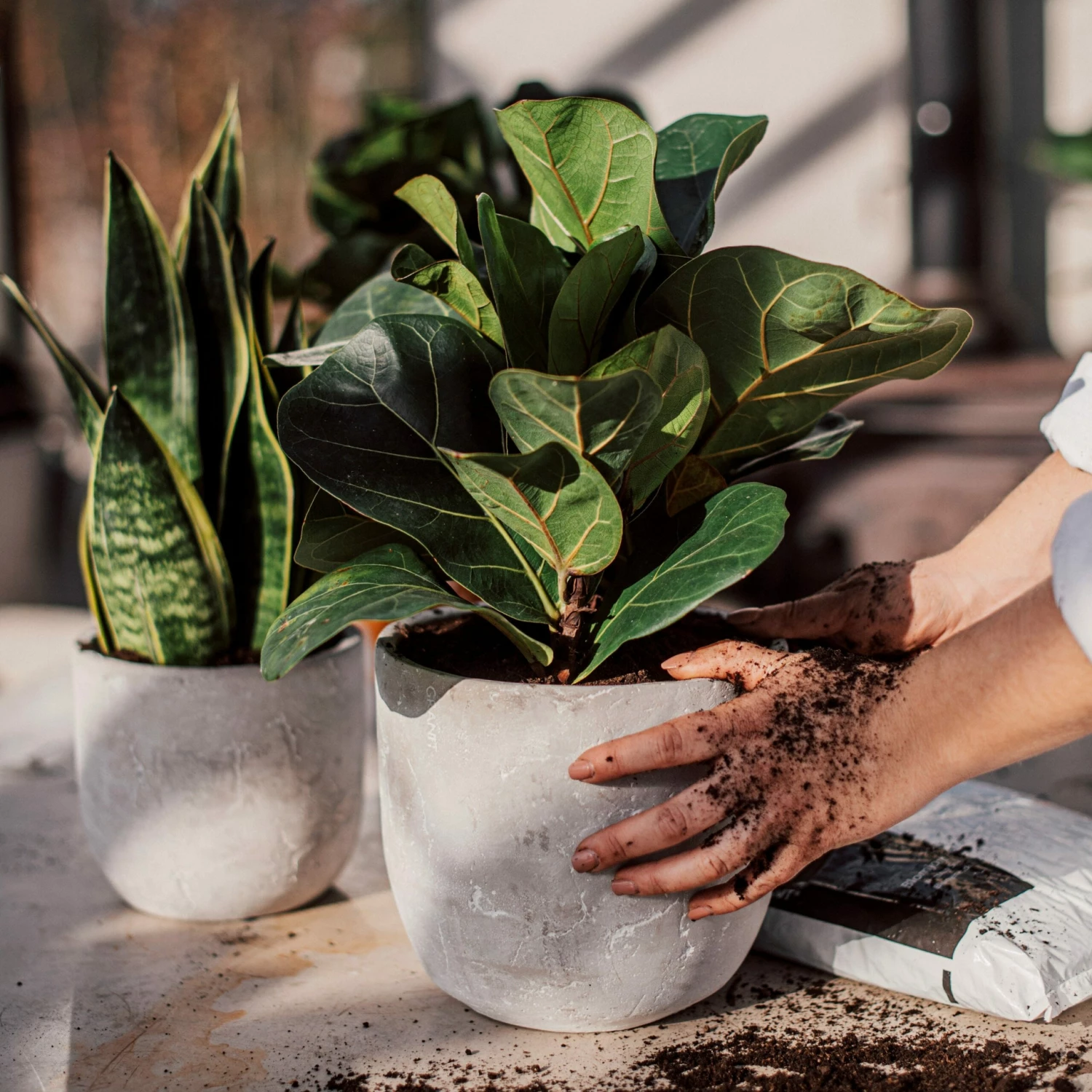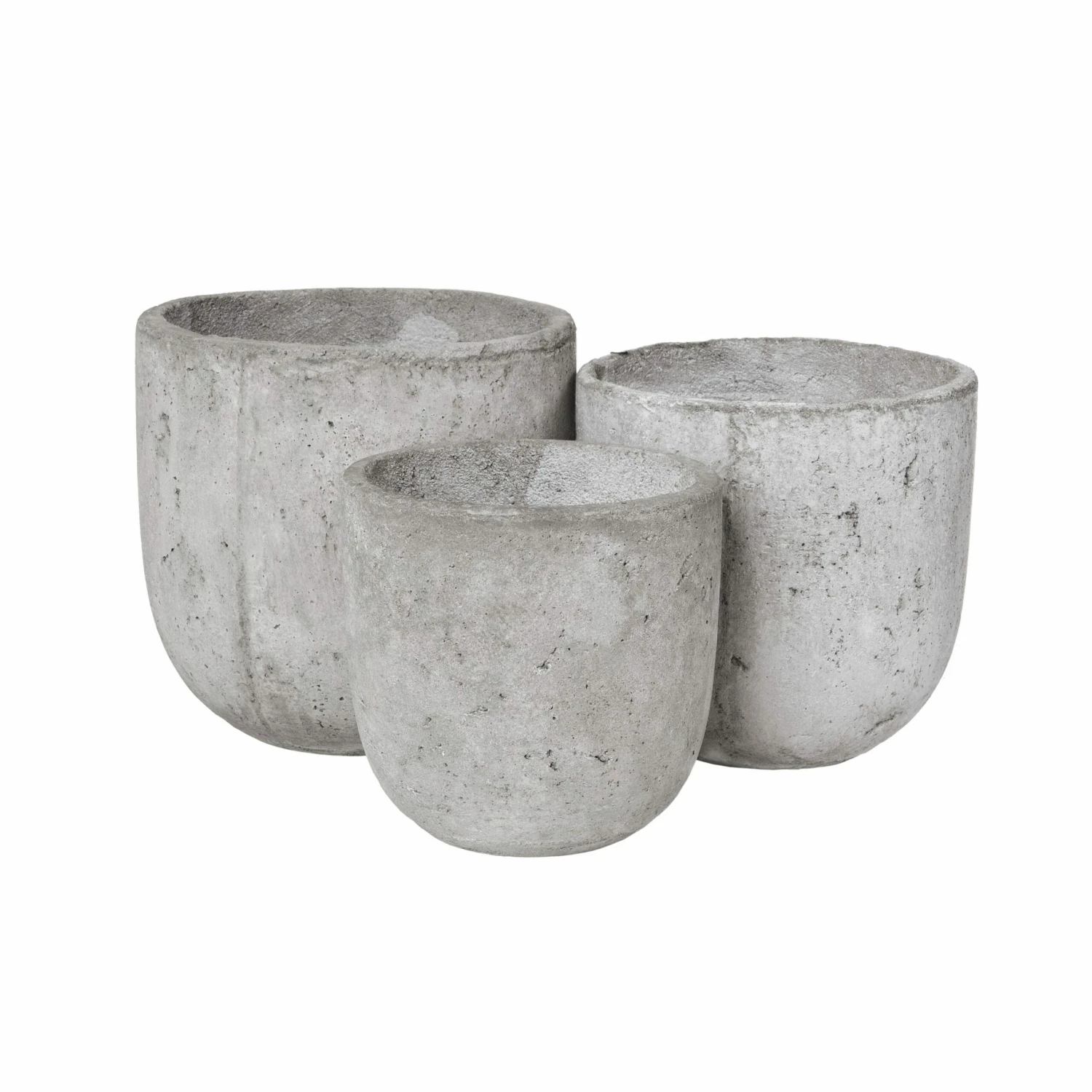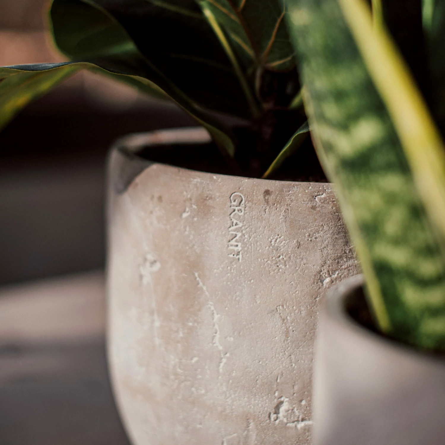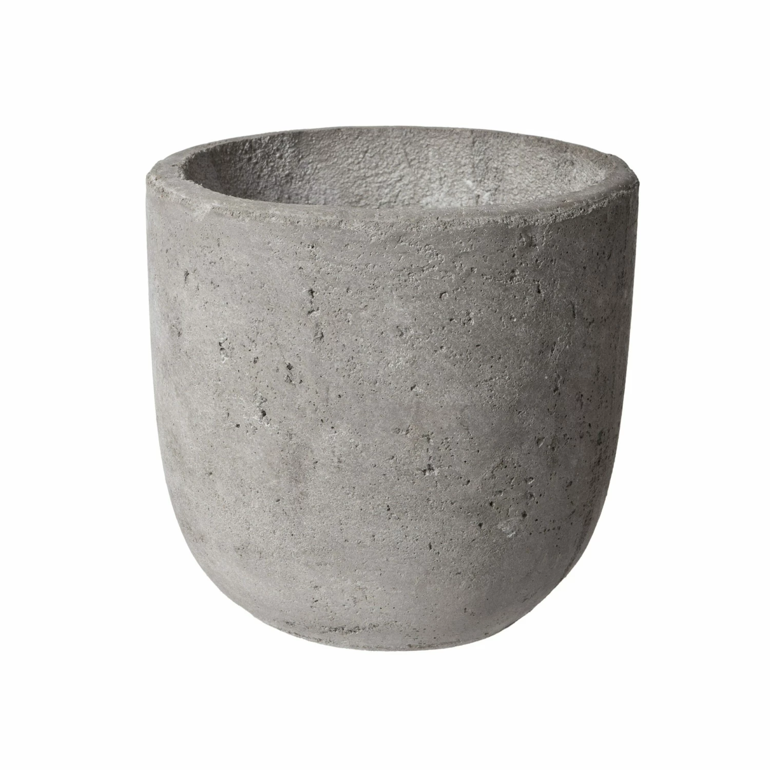 Runder Blumentopf aus Beton in zeitlosem Design, der die Pflanze in den Mittelpunkt rückt. Gruppiere die Blumentöpfe mit anderen Blumentöpfen in verschiedenen Größen.