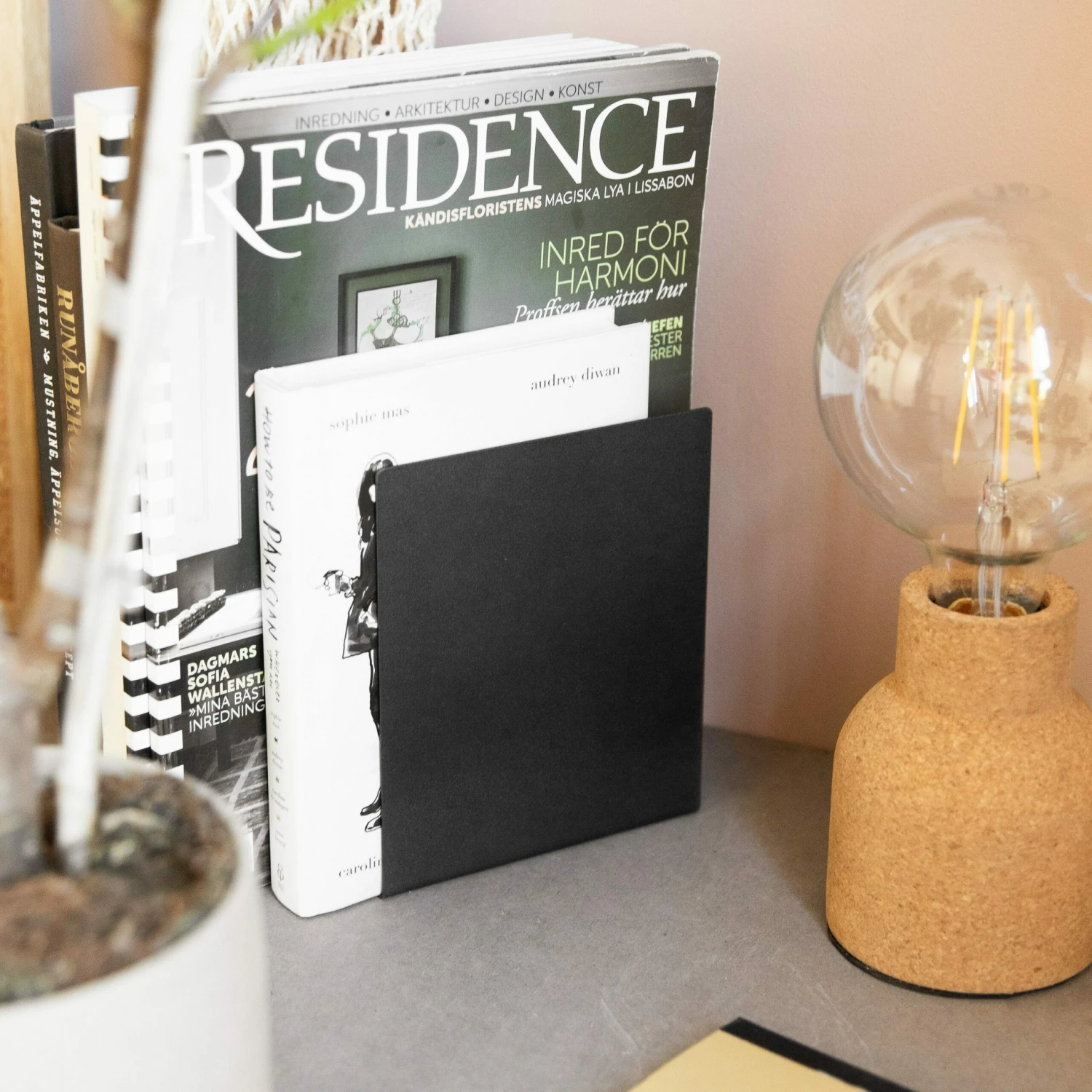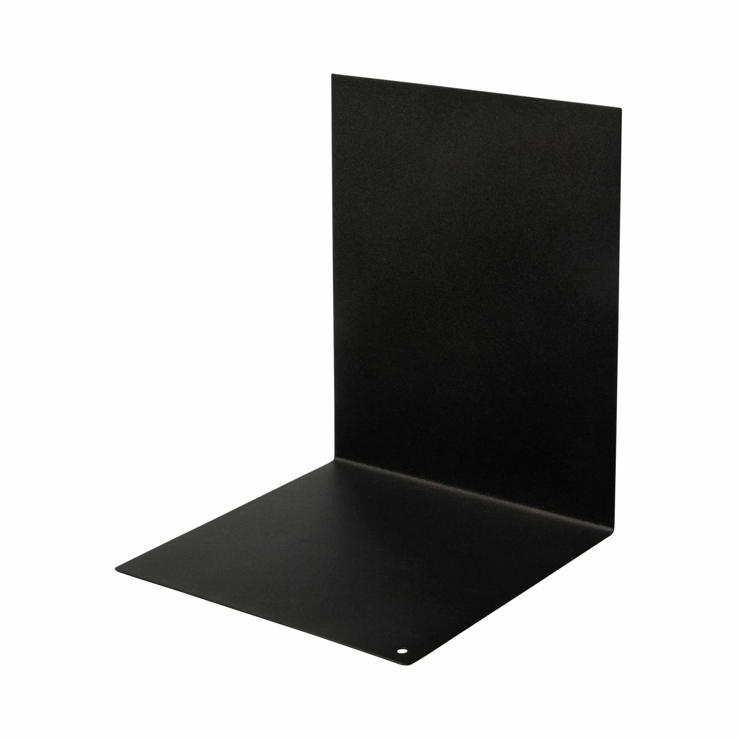 Praktische schwarze Buchstütze aus dünnem pulverbeschichteten Metall.