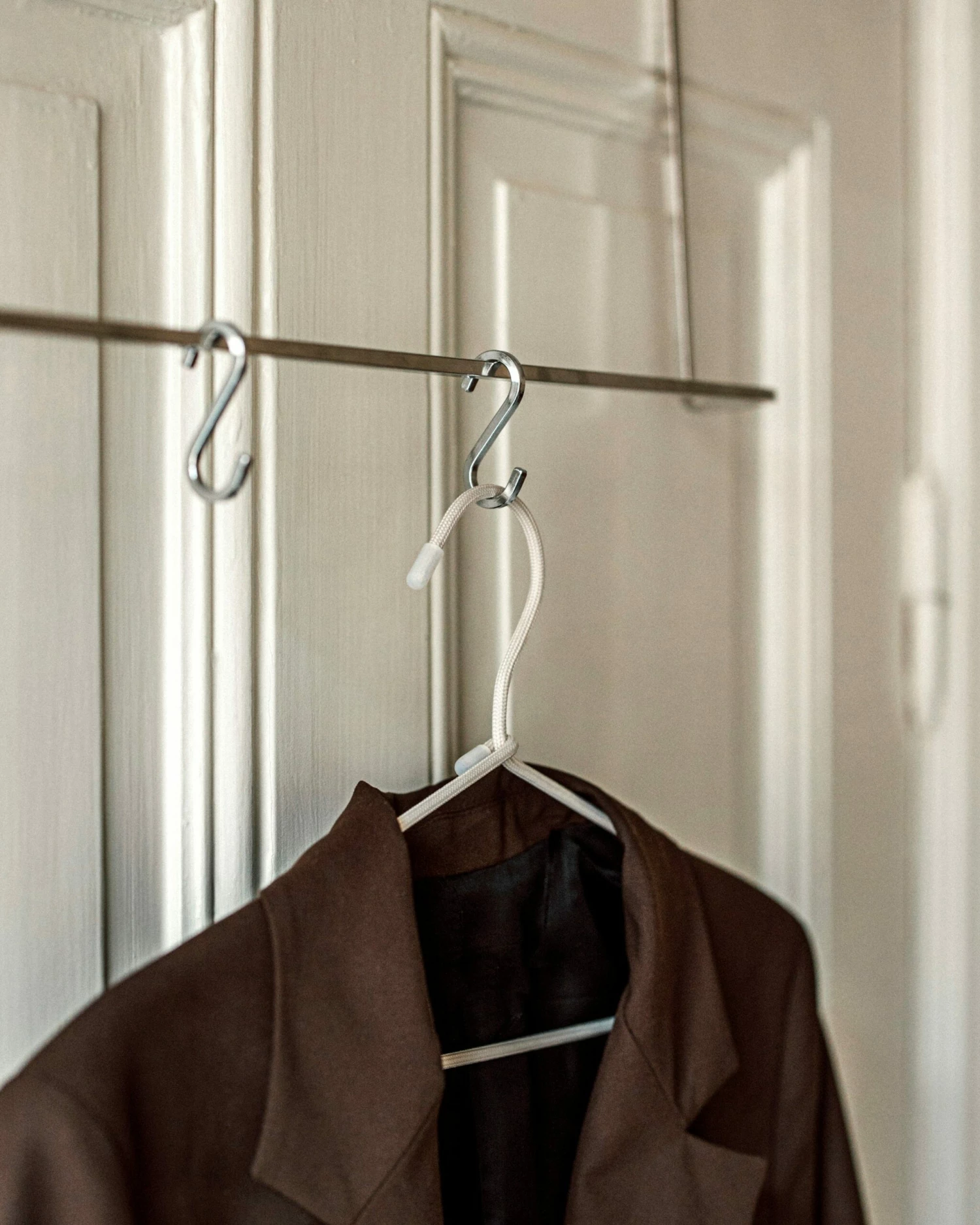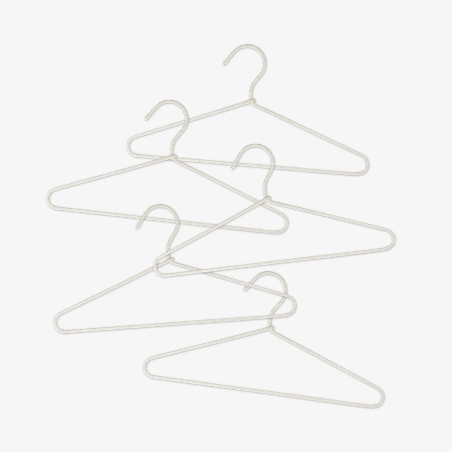 5-pack med tygklädda galgar i beige som ger en lite mjukare känsla till garderoben, både i färg och material. Galgarna är gjorda av kolstål och klädda med PE och Polyester, med ändar i silikon för att undvika att kläderna glider av galgen.