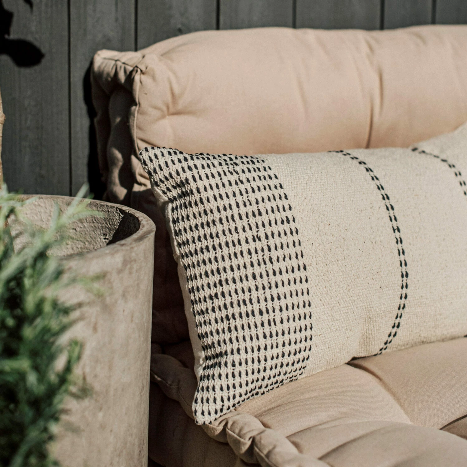 Nice decorative cotton cushion in a warm gray color with decorative stitches in contrasting black. Inner cushion is included in the price.