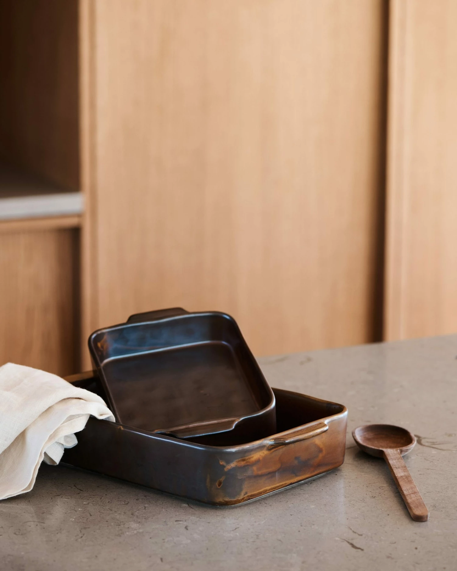 Elegante braune Auflaufform, ideal für Gratins und Desserts, aus hochgebranntem Porzellan mit einer haltbaren Glasur, die nicht zerkratzt oder abplatzt. Mit griffigen Griffen und hohen Seitenwänden, die das Verschütten von Flüssigkeiten verhindern. Die Formen bestehen aus hochgebranntem Porzellan mit einer haltbaren Glasur, die nicht zerkratzt oder abplatzt und die das Servieren zu einem Kinderspiel macht. Hält dem täglichen Gebrauch und Temperaturschwankungen stand.
