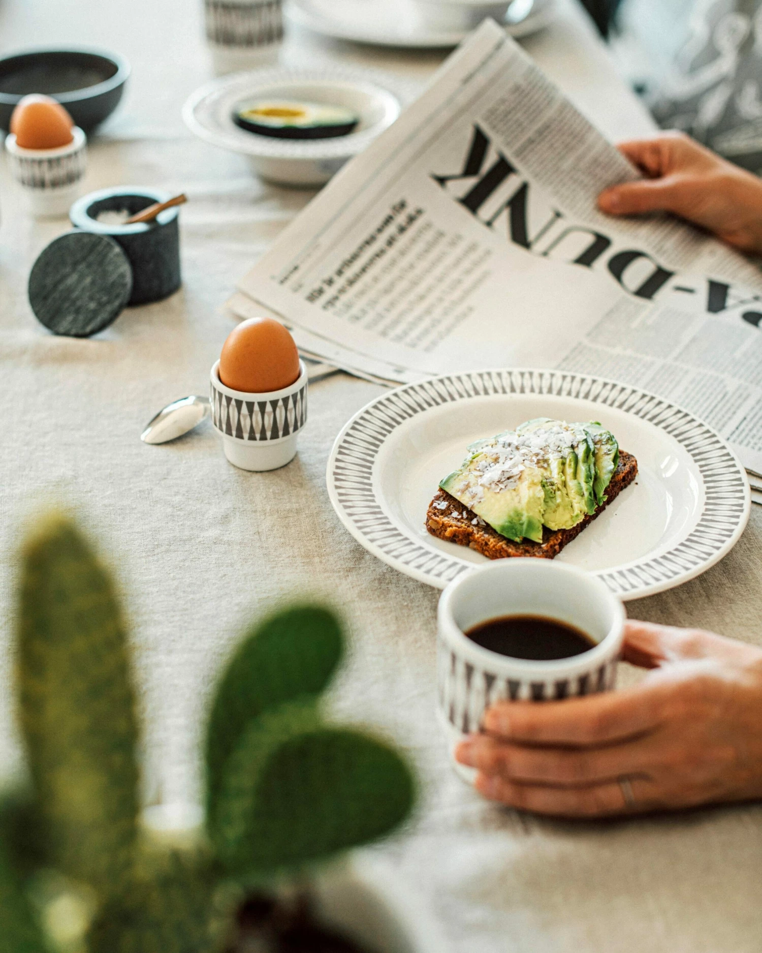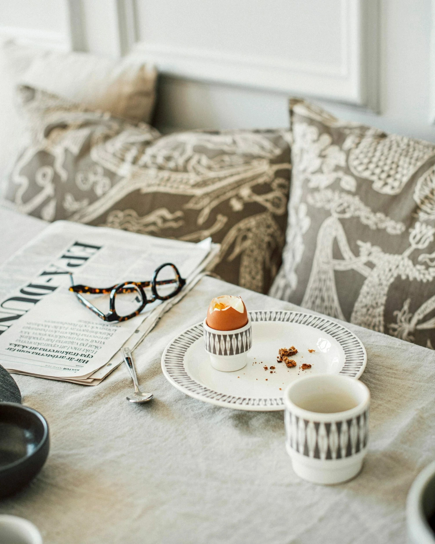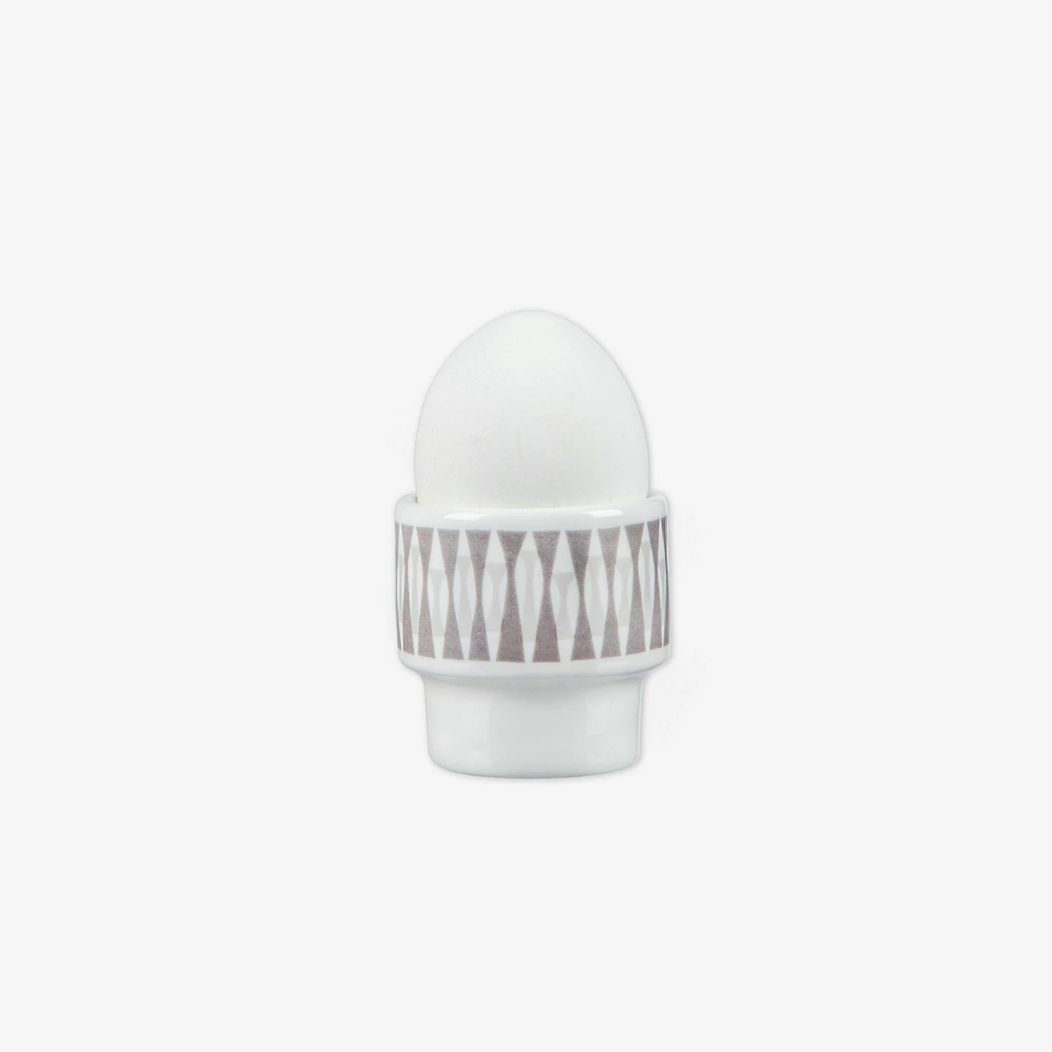 | Ein ästhetischer, glasierter Eierbecher, der mit einem Hauch von Retro kokettiert. Das Steingutservice ist mit dem Diabolo-Muster in zwei Grautönen verziert. Das ganze Service umfasst einen Teller, eine Schüssel, eine Tasse und einen kleinen Teller. Eine einzigartige Zusammenarbeit, bei der Granit ausgewählte, von Stig Lindberg entworfene Muster interpretiert hat. Gegenwart und Vergangenheit treffen aufeinander – und das mit einem tollen Twist! Maße: H 5,2 cm Ø 5,2 cm.Spülmaschinen- und mikrowellenfest. DIABOLO – Das Diabolo-Muster ist Teil der Kollektion „Skandinavischer Akkord“, einer Zusammenarbeit, die 1958 zwischen der Textilabteilung der Nordiska Kompaniet und dem deutschen Kunststoffhersteller Göppinger entstand. Diese Muster wurden von Hand auf Kunststoffgewebe gedruckt, die unter anderem zu Vorhängen verarbeitet wurden. Stig Lindberg steuerte drei Entwürfe bei, von denen Diabolo einer war. Granit hat das Muster auf einem Porzellanservice und auf Blumentöpfen reproduziert. |