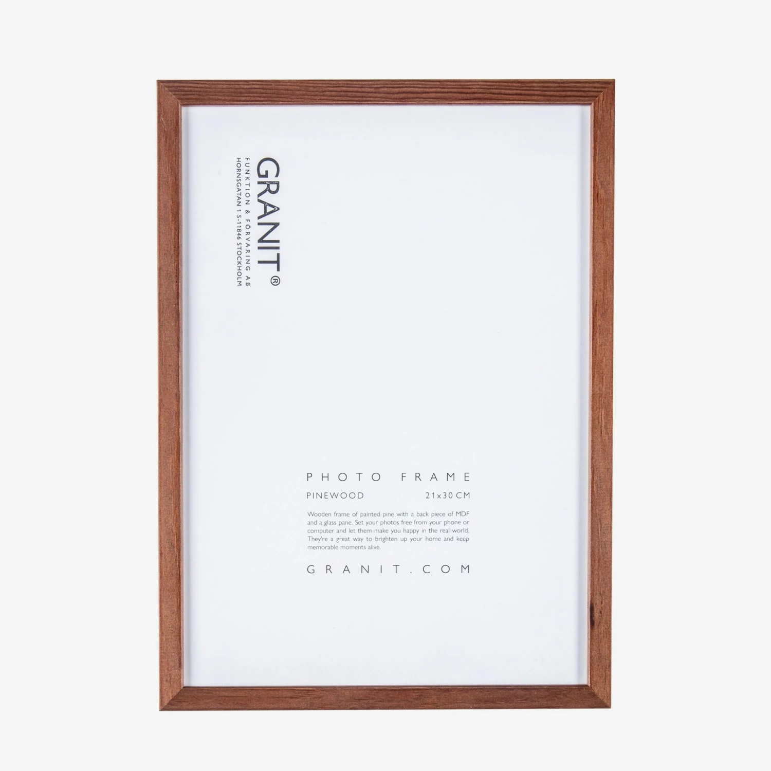 Träram i betsad furu med glasruta. Valnötstonen ger ramen en varm och hemtrevlig känsla. Ramen har ett bakstycke i Mdf och finns i flera färger och storlekar så att du enkelt kan matcha dina tavlor i olika storlekar för en fin och enhetlig effekt. Mått: 21 x 30 cm (A4). Måttet 21 x 30 cm är den yta du ser inuti ramen.