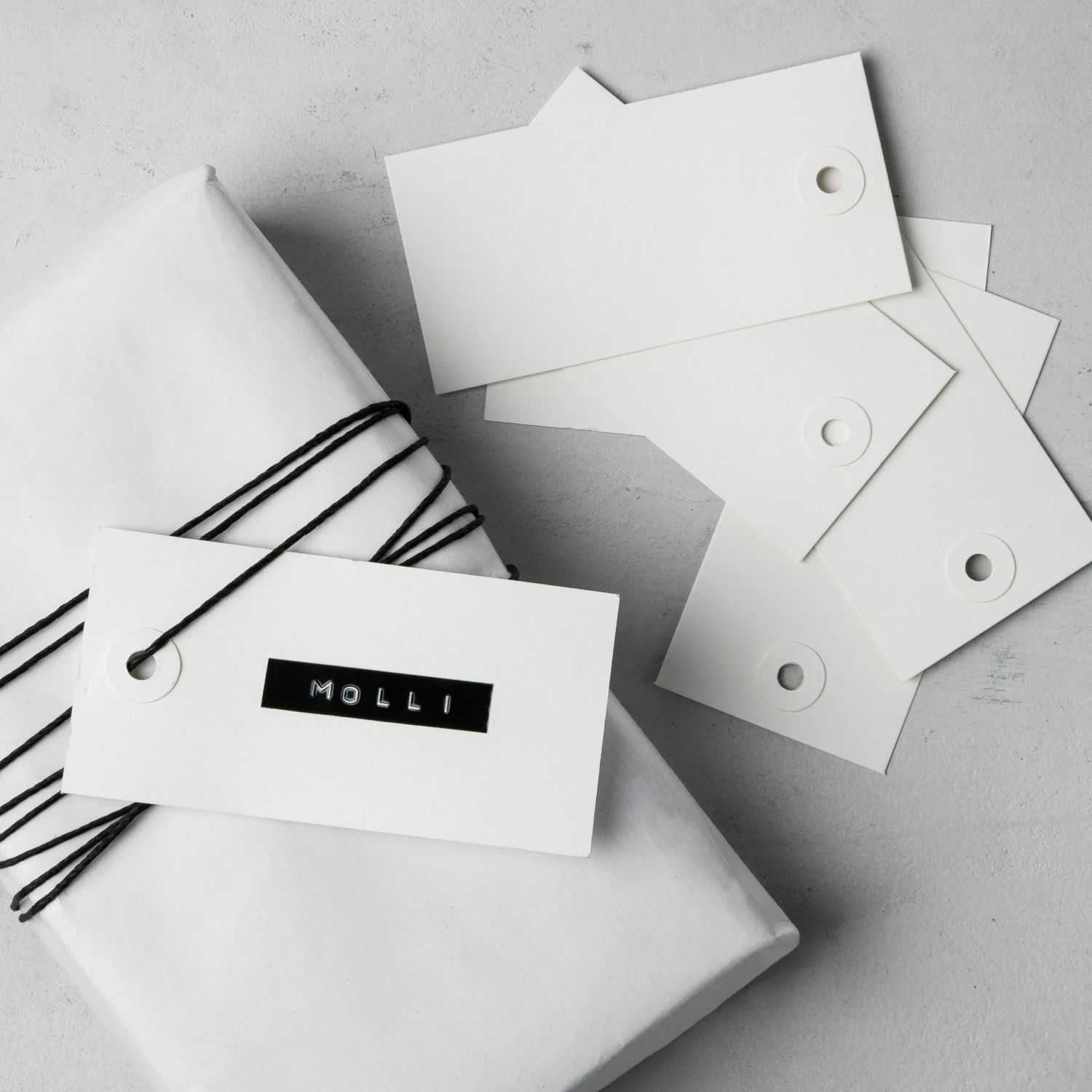 Hängeetiketten 10er-Pack Weiß. Diese weißen Hängeetiketten sind vielseitig einsetzbar. Geschenke bekommen eine persönliche Note und sehen neben einer Schleife aus Geschenkpapier gut aus. Auch als Deko-Element für deine nächste DIY-Idee sind diese Etiketten ideal. Im Büro kannst du sie zum Beschriften von Boxen, Mappen oder Ähnlichem verwenden. Hängeetiketten sehen auch bei selbstgemachten Sachen nicht nur schön aus, sondern können auch als Preisschild verwendet werden. Passend dazu findest du in unserem Shop auch Schnüre in verschiedenen Farben.