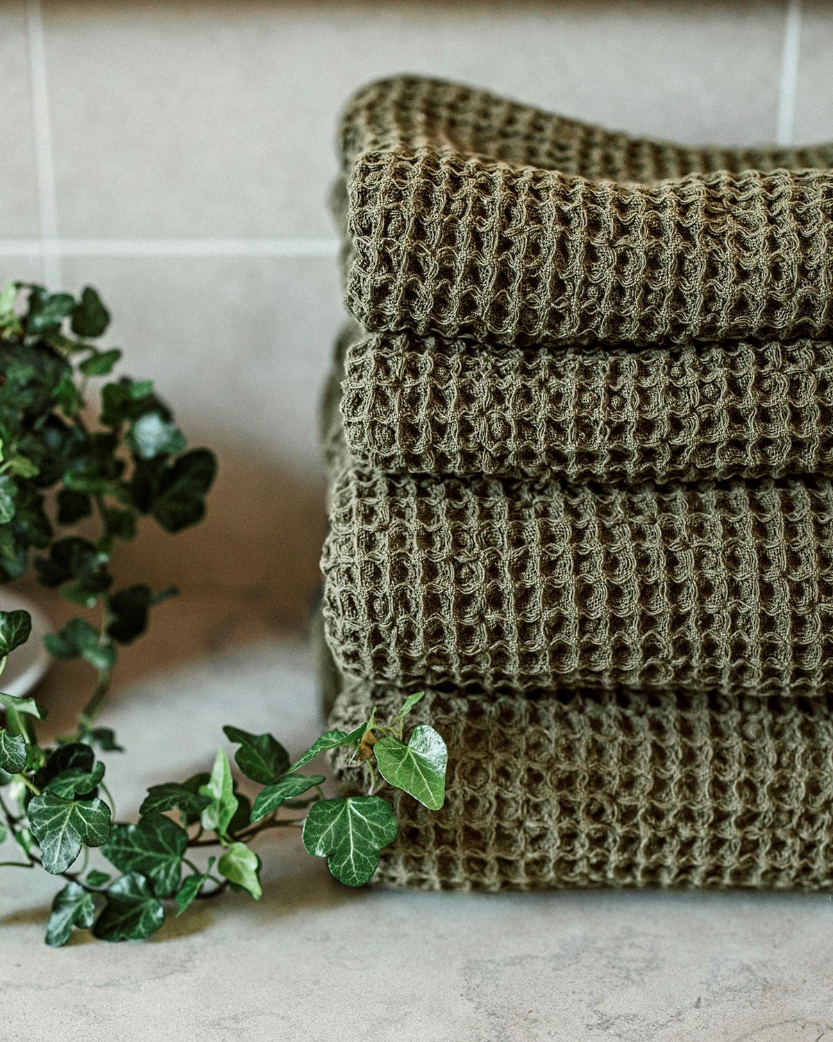 Khakigrünes Handtuch aus Bio-Baumwolle. Das Handtuch hat eine Waffelstruktur, die sich weich auf der Haut anfühlt. GOTS-zertifiziert und mit dem Öko-Tex-Siegel versehen. Erhältlich in verschiedenen Größen und Farben.