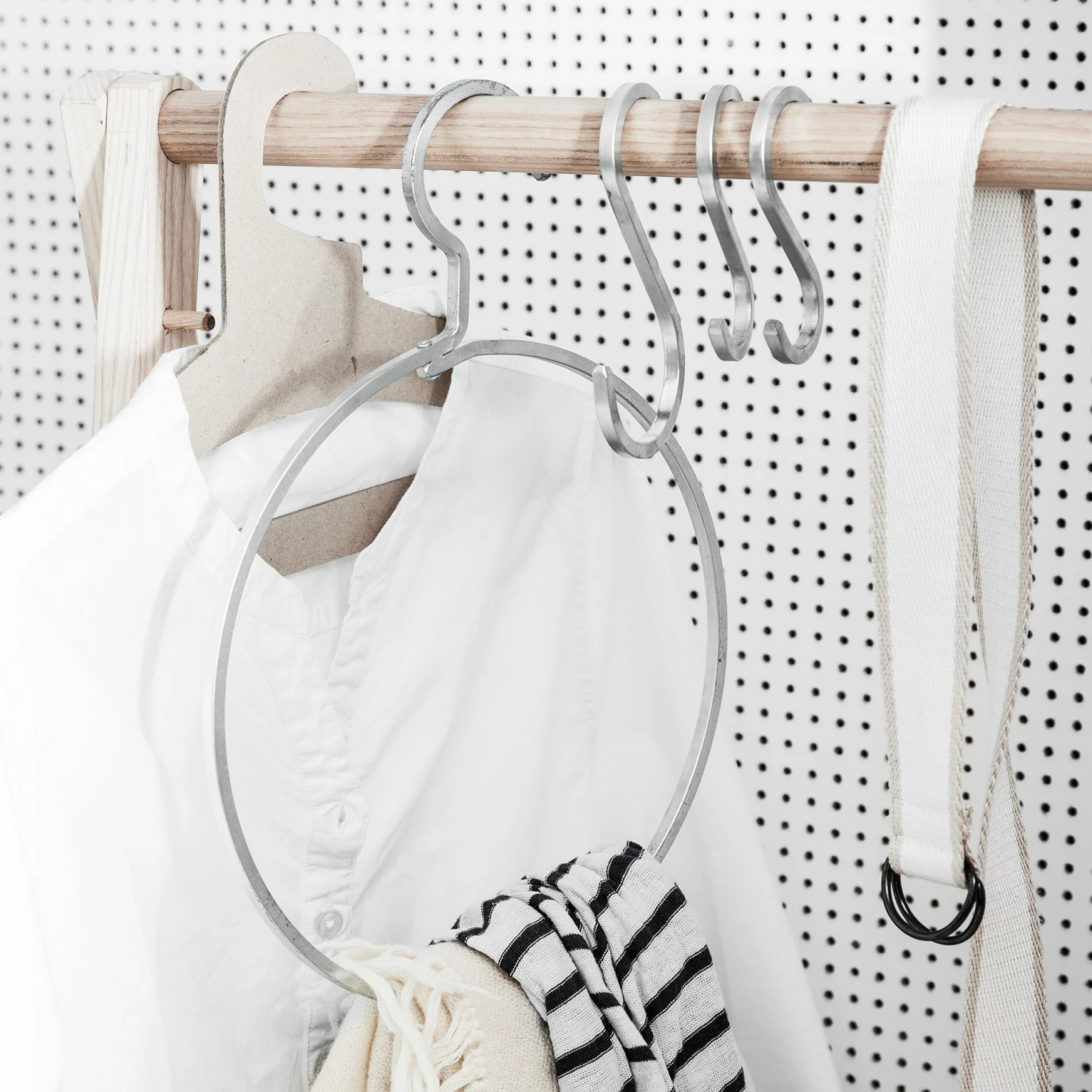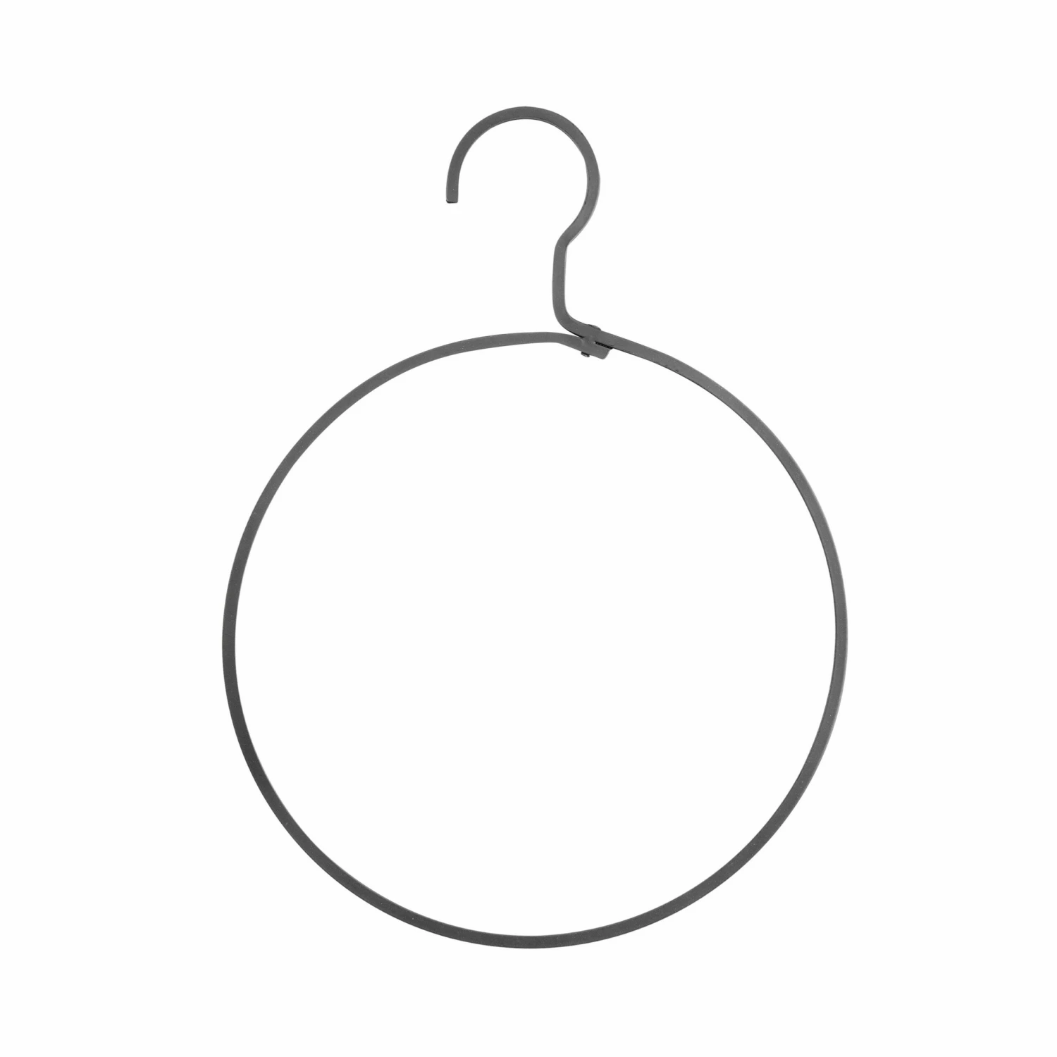 Runder Kleiderbügel aus schwarz lackiertem Eisen mit abgeflachten Seiten, die ihm ein robustes Aussehen verleihen. Der Bügel ist vielseitig einsetzbar. Der Kreis hat einen Innendurchmesser von 26 cm.