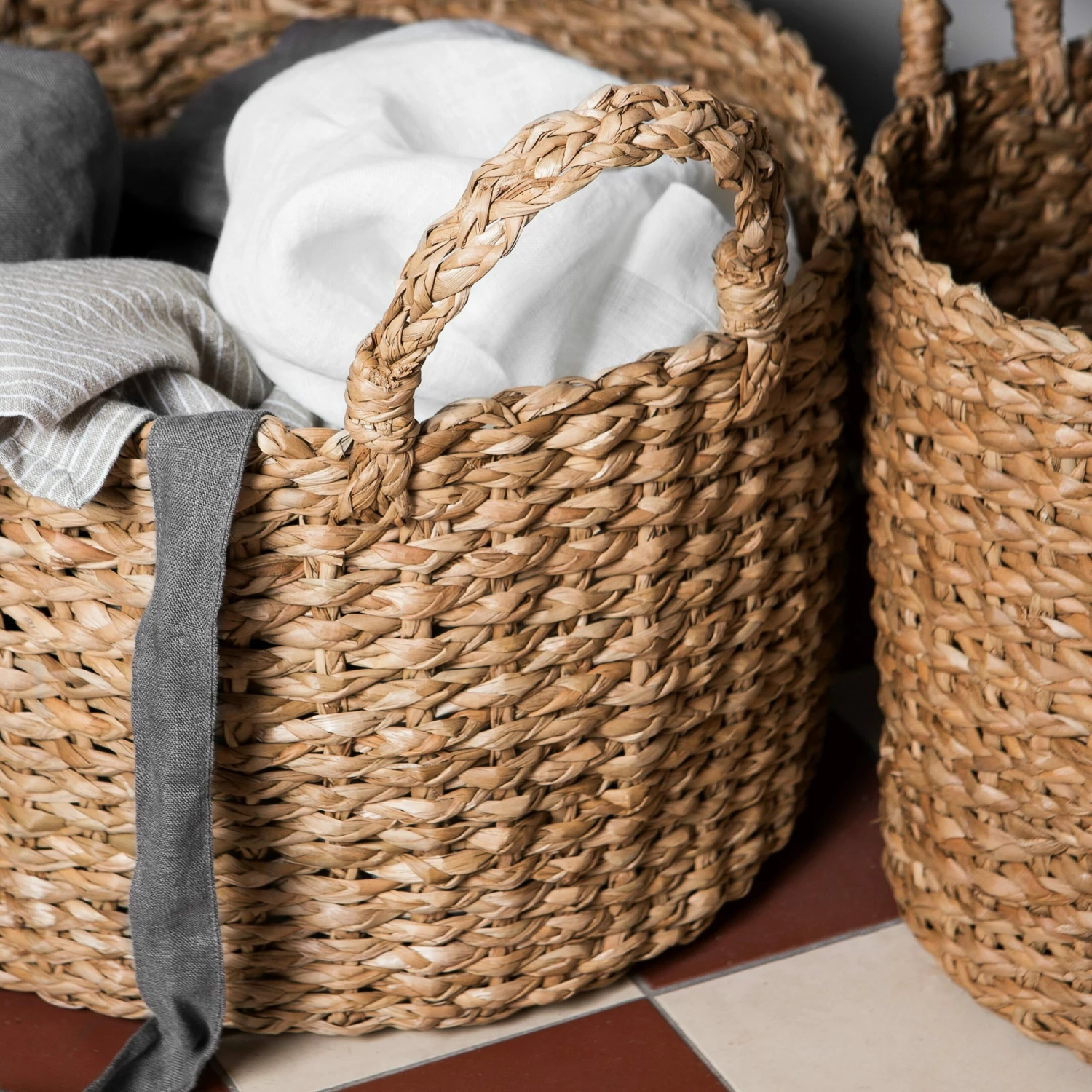 Korb mit Griff aus dem Naturmaterial Abaca, handgefertigt auf den Philippinen. Die Abacafasern stammen von dem gleichnamigen Baum, auch Manilahanf genannt, aus der Gattung der Bananenpflanzen. Die widerstandsfähigen Fasern werden in der Sonne getrocknet und dann zu Körben in verschiedenen Modellen verarbeitet. Es dauert ca. 1,5 Tage einen Korb herzustellen. Das Familienunternehmen auf den Philippinen versorgt ca. 2500 Familien, die entweder direkt in der Herstellung arbeiten oder die Produzenten der Rohmaterialien Abaca oder Bast sind. Die Fabrik liegt 50 km südlich von Manila.