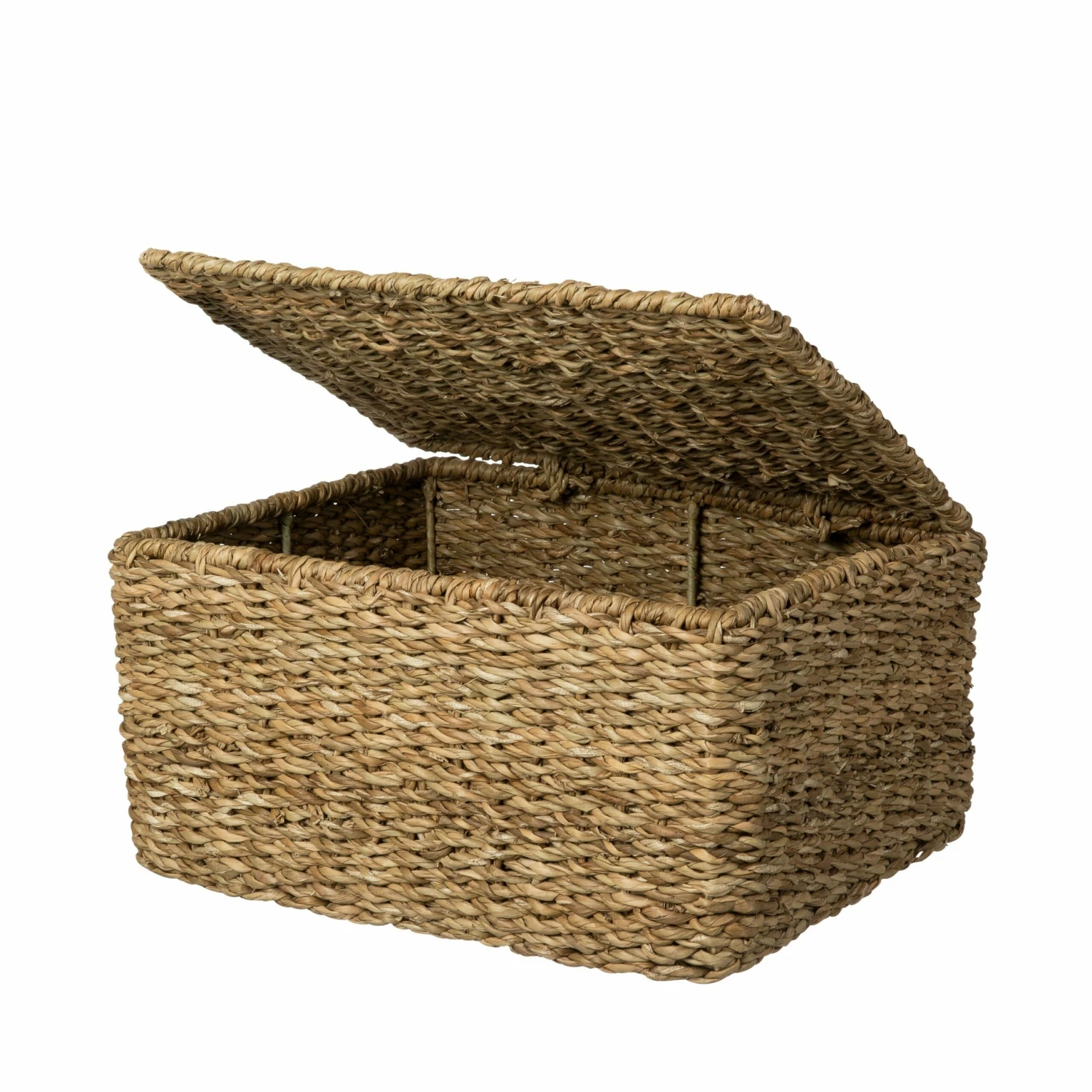 Ein geflochtener quadratischer Korb mit Deckel von aus dem Material Hoogla, perfekt für alle Arten von Aufbewahrung. Auch in zwei kleineren Größen erhältlich.Hoogla ist ein Gras, das in den südlichen Teilen von Bangladesch wächst. Das Gras wird zwischen Februar und März von den örtlichen Landwirten geerntet und wird seit langem für die Herstellung von Haushaltsgeräten verwendet. Der Lieferant hat sich dieses Wissen und diese Tradition zu Nutze gemacht, und gemeinsam mit ihm wollen wir eine Produktion fördern, die größtmögliche Rücksicht auf Mensch und Umwelt nimmt. Die Körbe sind zeitlose, nachhaltige Produkte mit einem modernen Touch, handgefertigt aus Materialien, die ohne Agrochemikalien und künstlicher Bewässerung angebaut werden.