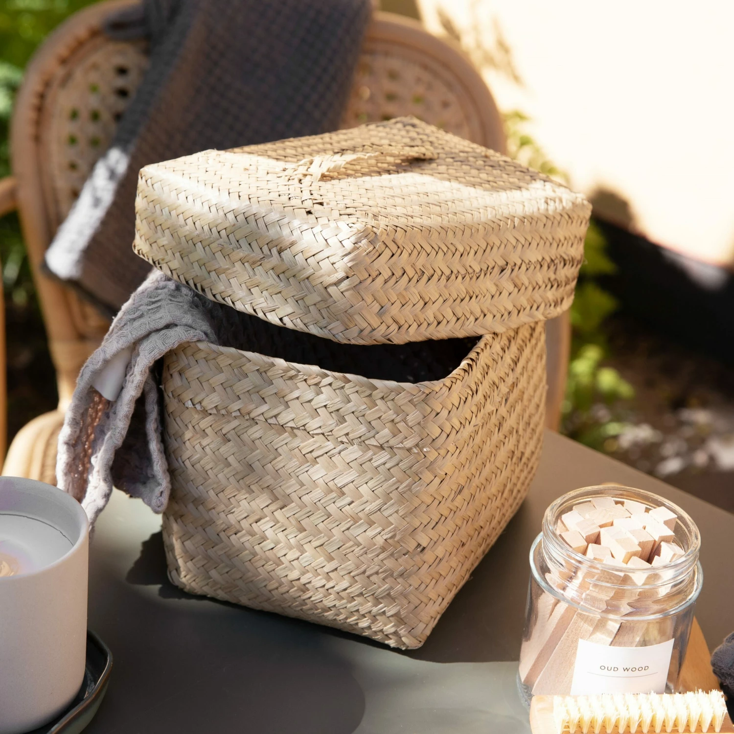 Rechteckiger kleinerer Korb aus Seegras mit passendem Deckel. Der Deckel hat einen Griff an der Oberseite. Auch in zwei größeren Größen erhältlich!