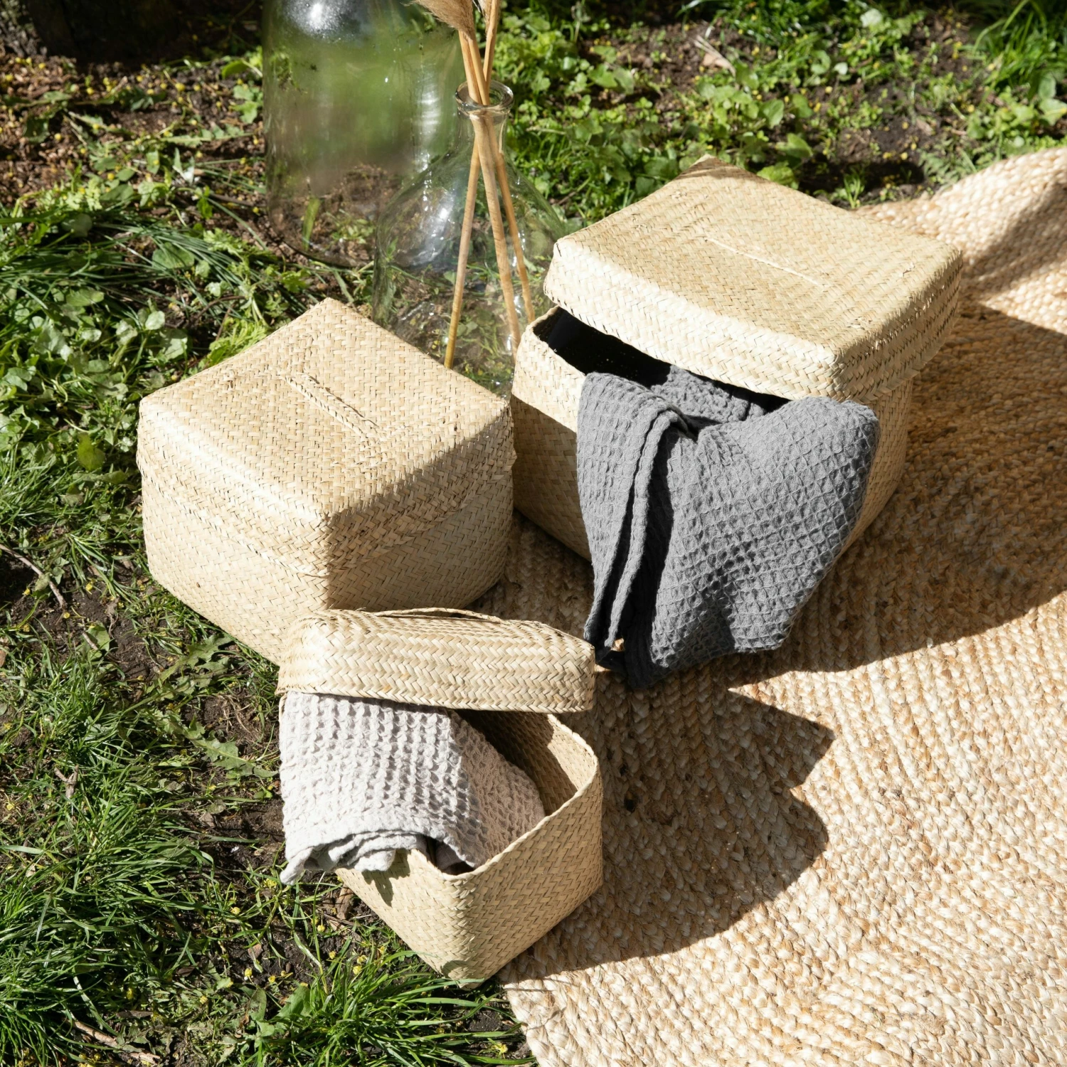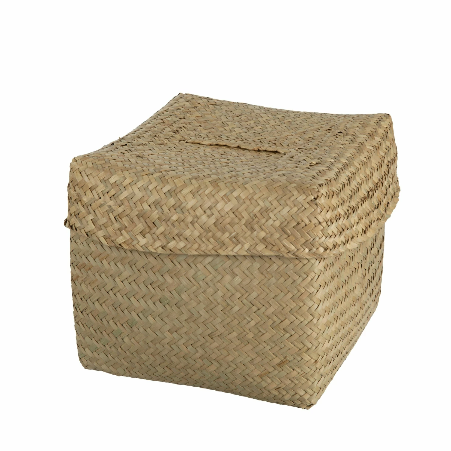 Rechteckiger Korb aus Seegras mit passendem Deckel. Der Deckel hat einen Griff an der Oberseite. Auch in einer kleineren und einer größeren Größe erhältlich!