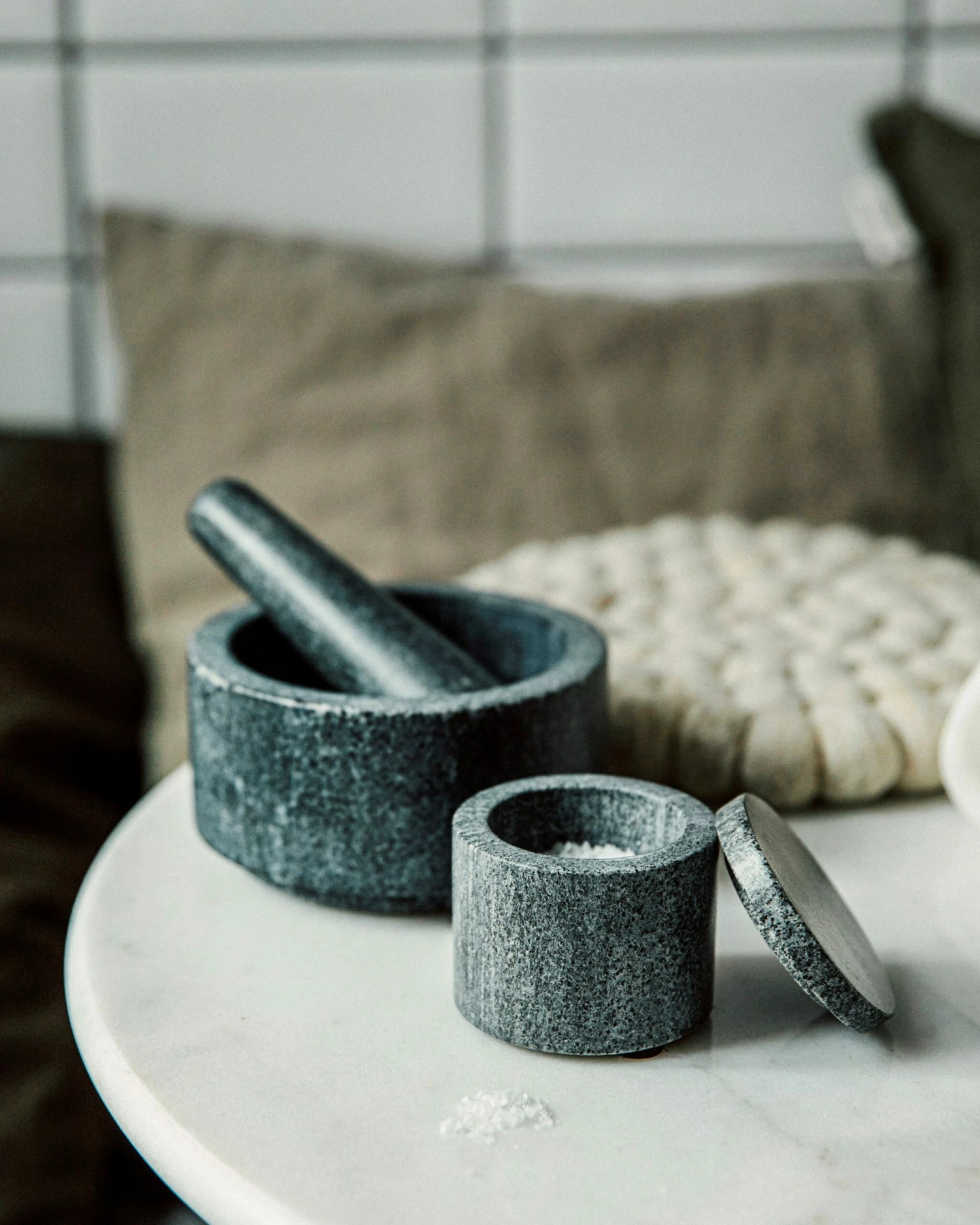Ein praktischer und stabiler Marmormörser mit dem du deinen Gewürzen die perfekte Konsistenz gibst. Dank des Gewichts des Marmors ist dieser Mörser sehr stabil und auch ein schönes Detail in der Küche. Entdecke unsere passenden Küchenaccessoires im gleichen Design.Marmor ist ein natürliches Material, das sowohl in der Farbe als auch in der Form variieren kann – kein Produkt gleicht dem anderen.Maße: H 6,4 Ø 12,7 cm.