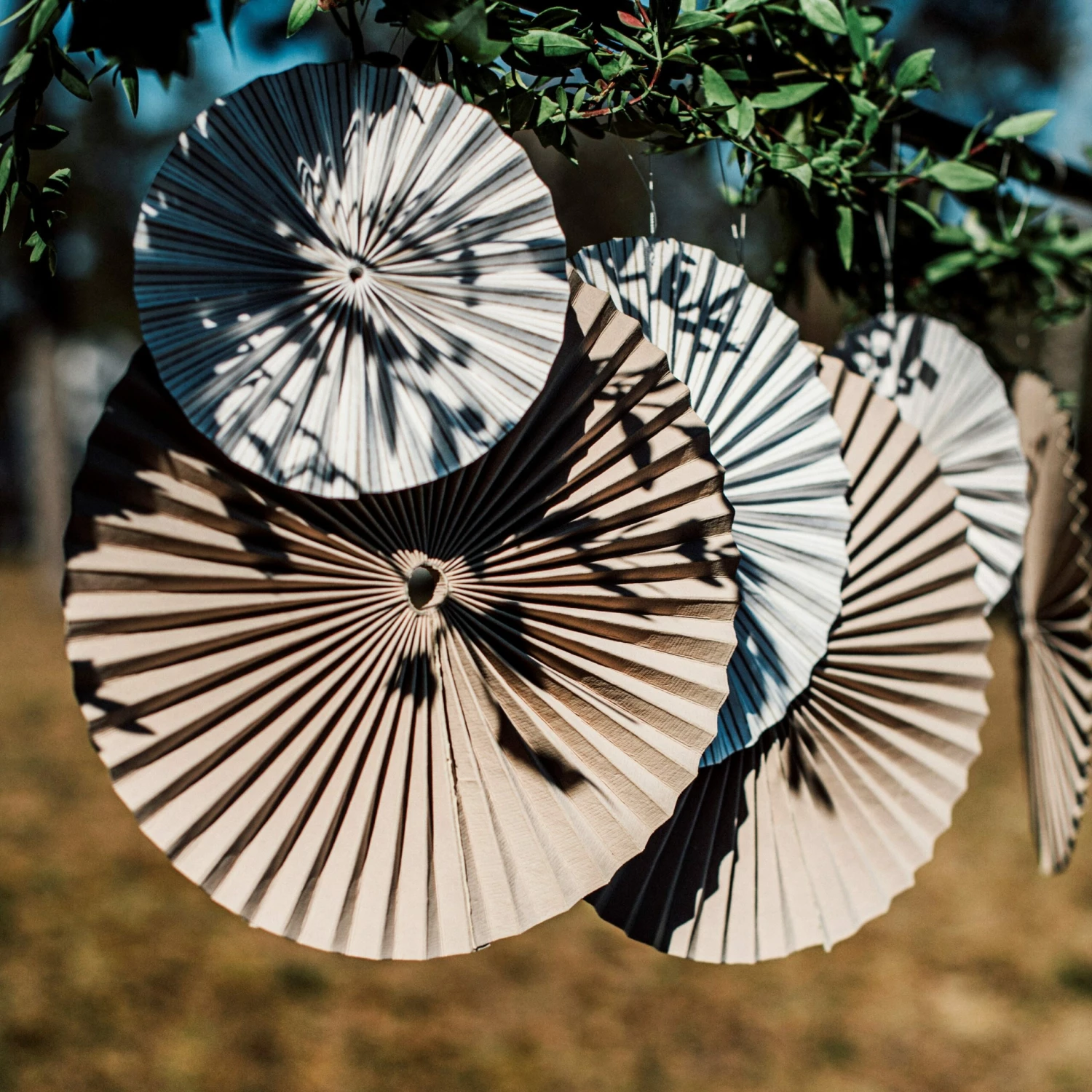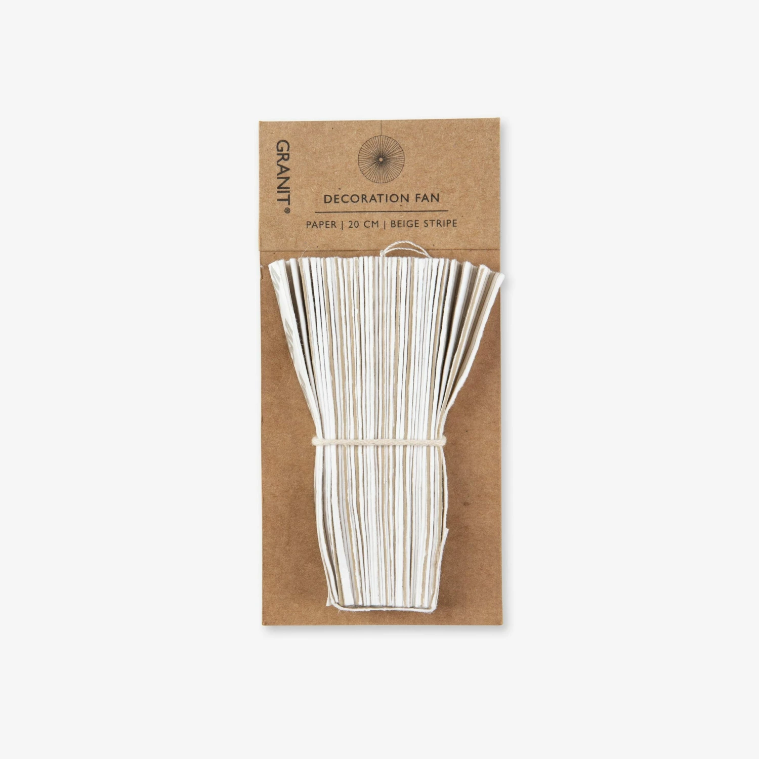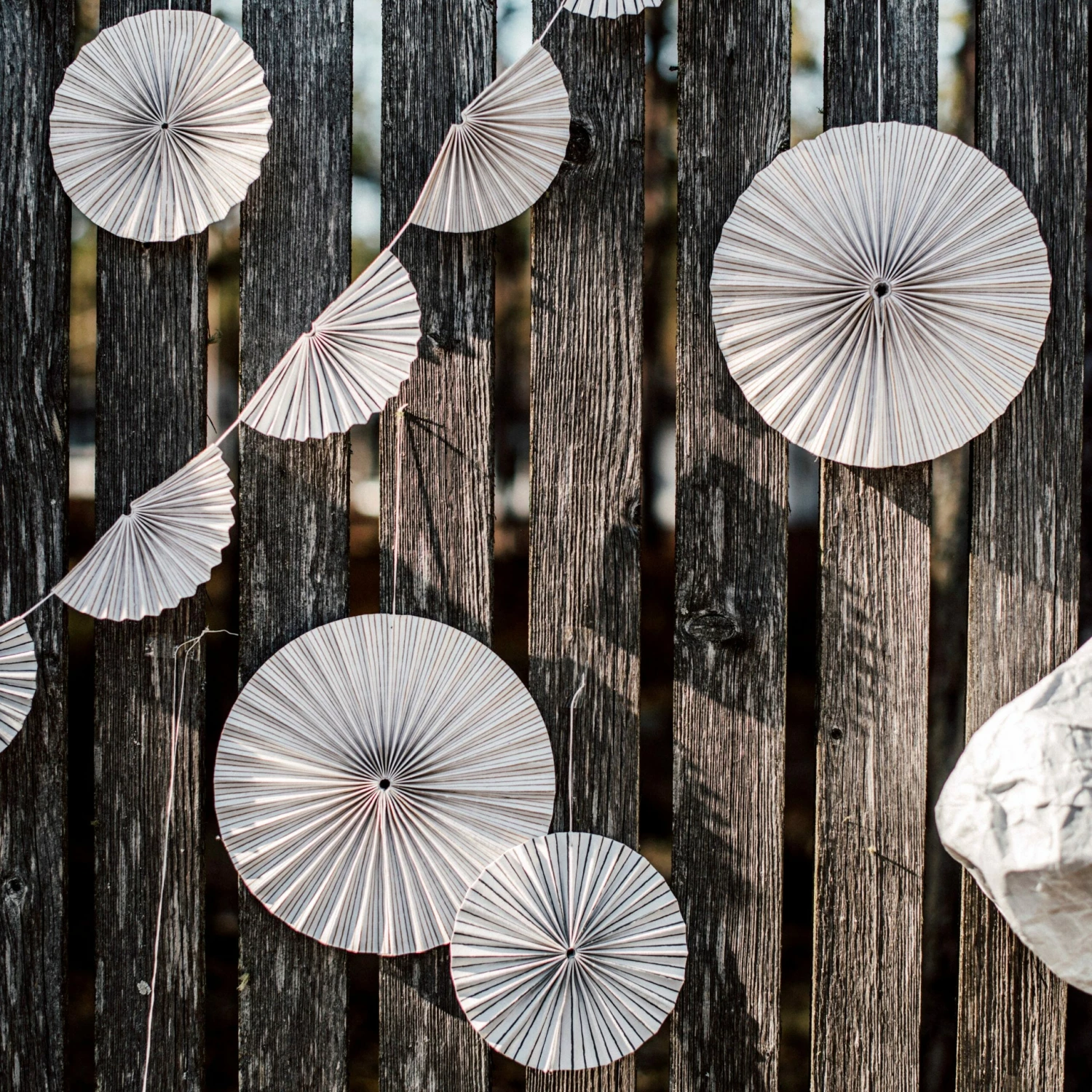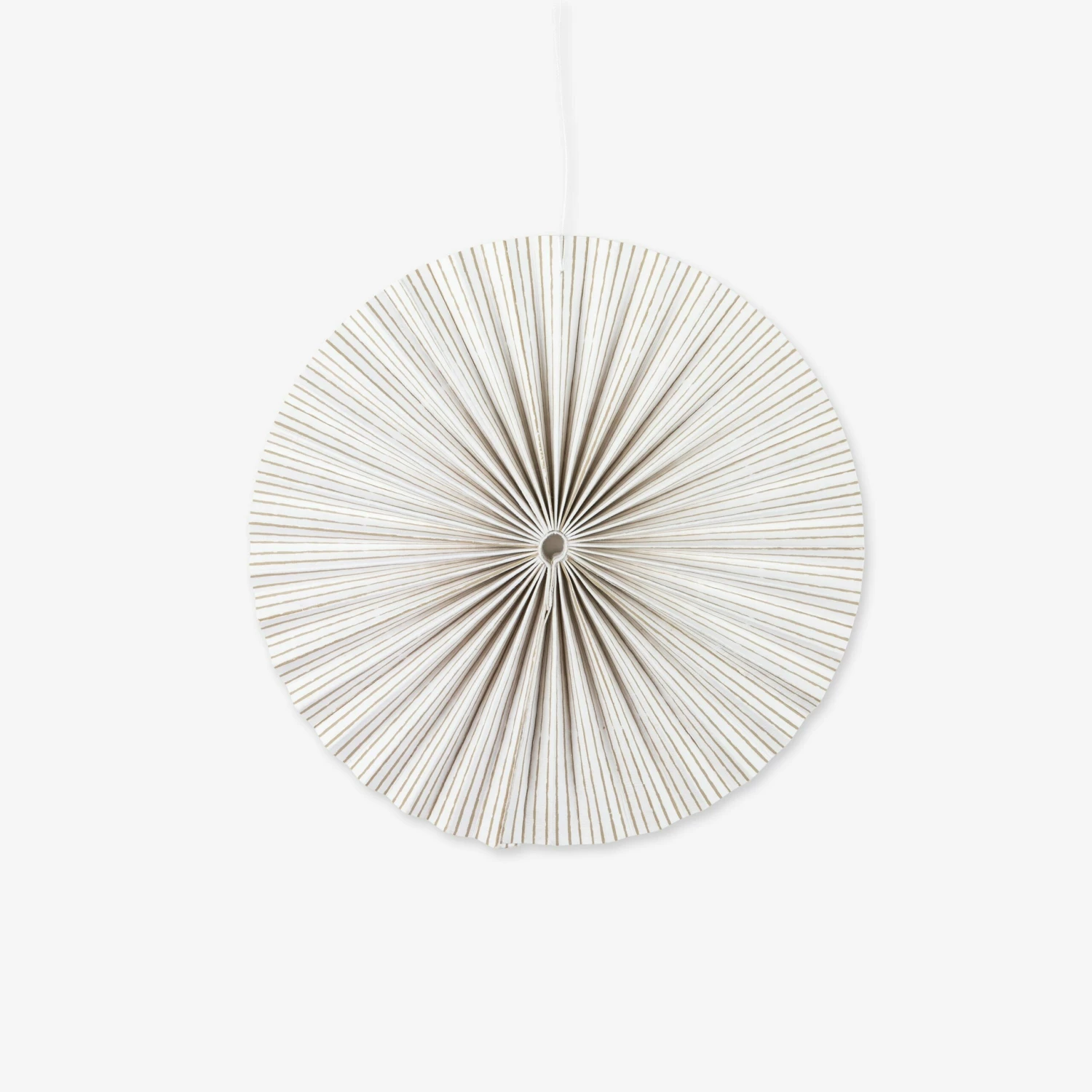 Papierdekorationen in Form von gefalteten Kreisen. Verwende die Dekorationen wie du möchtest! Kombiniere verschiedene Größen und Farben. Du kannst sie zum Beispiel als Tischdekoration an unsere Aufhänger hängen. Naturweiß mit beigen Streifen. Die Dekoration lässt sich aufklappen und mit seitlich angebrachten Klebestreifen leicht befestigen. Inklusive Kordel. Hergestellt aus recyceltem Baumwollpapier.Maße: Ø 20 cm