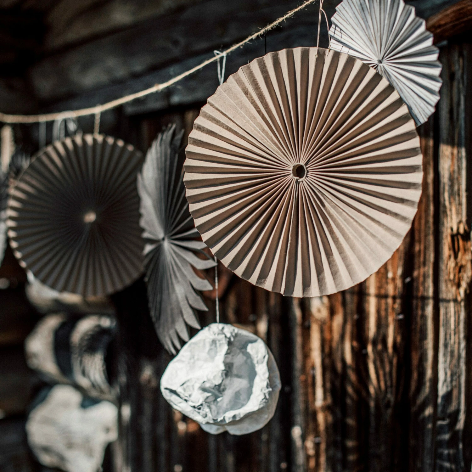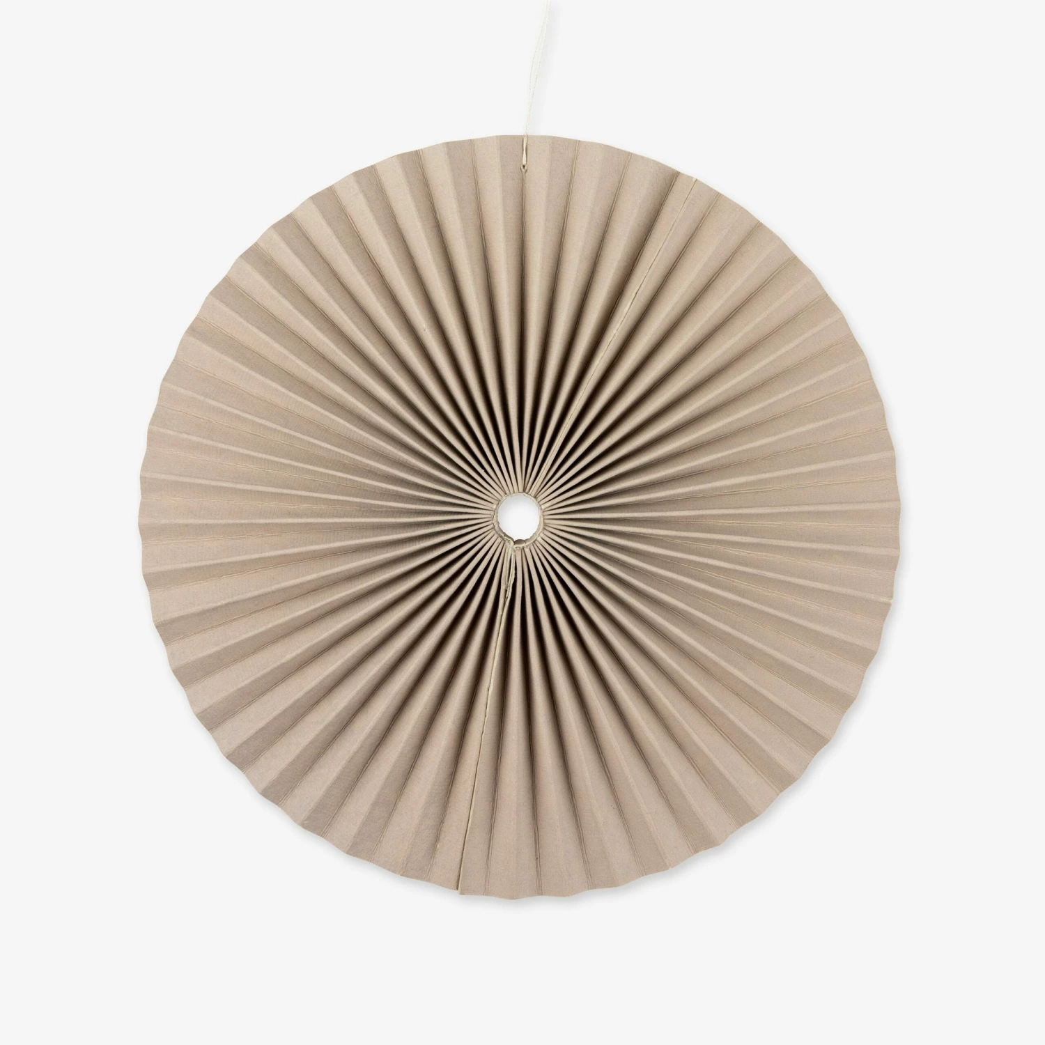 Papierdekorationen in Form von gefalteten Kreisen. Verwende die Dekorationen wie du möchtest! Kombiniere verschiedene Größen und Farben. Du kannst sie zum Beispiel als Tischdekoration an unsere Aufhänger hängen.Die beige Dekoration lässt sich aufklappen und mit seitlich angebrachten Klebestreifen leicht befestigen. Inklusive Kordel. Hergestellt aus recyceltem Baumwollpapier.Maße: Ø 24 cm