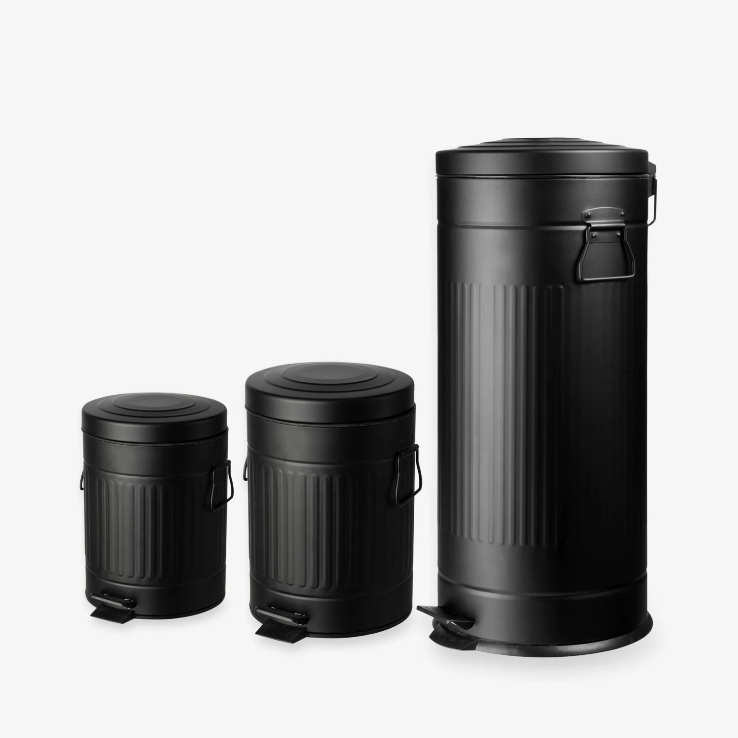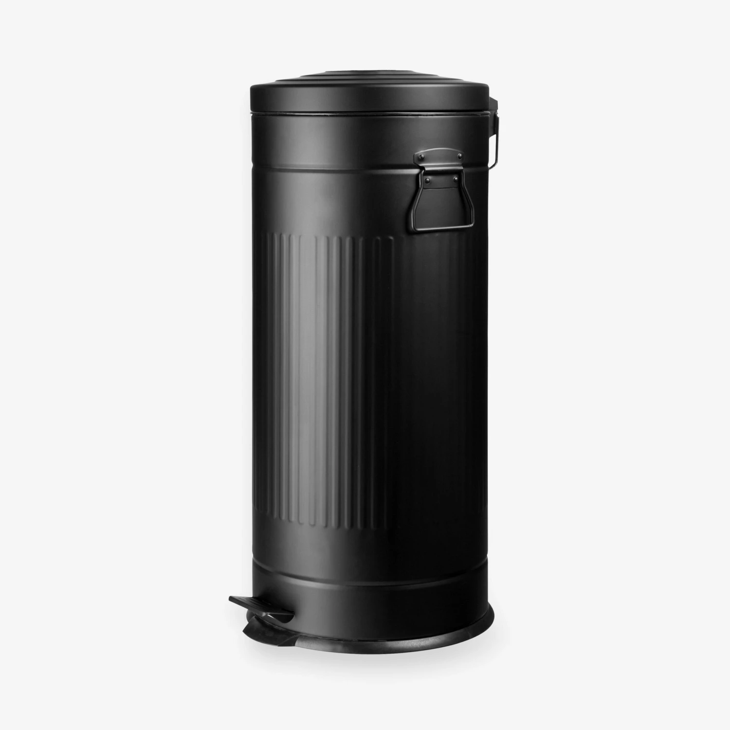 Schwarzer Pedal-Eimer aus Metall mit herausnehmbarem Kunststoffeimer, der 30 Liter fasst. Auch in zwei kleineren Größen erhältlich.