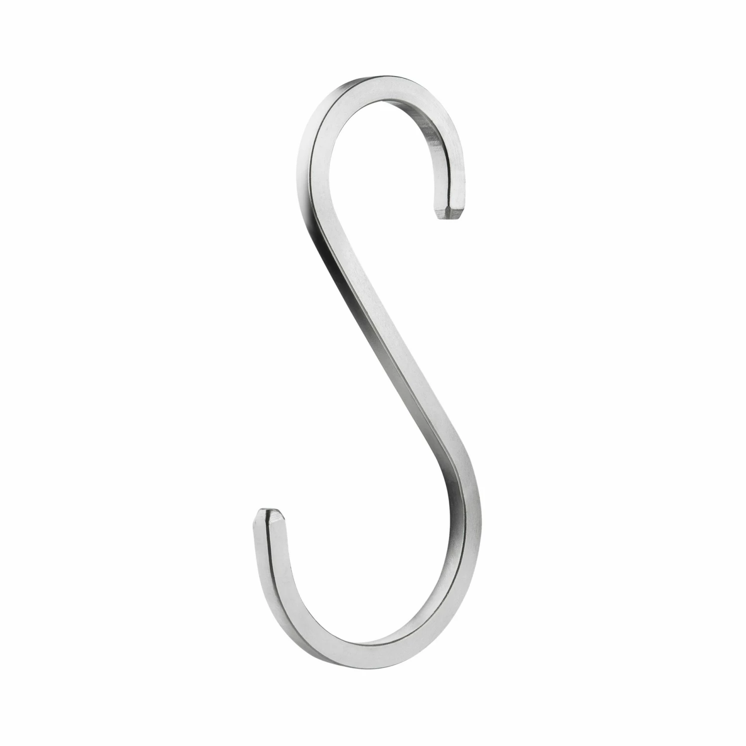 Stabiler und flexibler S-Haken aus Eisen mit flachen, abgeschrägten Seiten. Die Haken haben unterschiedliche Innendurchmesser von 3 cm bzw. 5 cm. Praktische Alternative oder Ergänzung zu Kleiderbügeln, Wandhaken usw. Auch in einer kleineren Ausführung erhältlich.