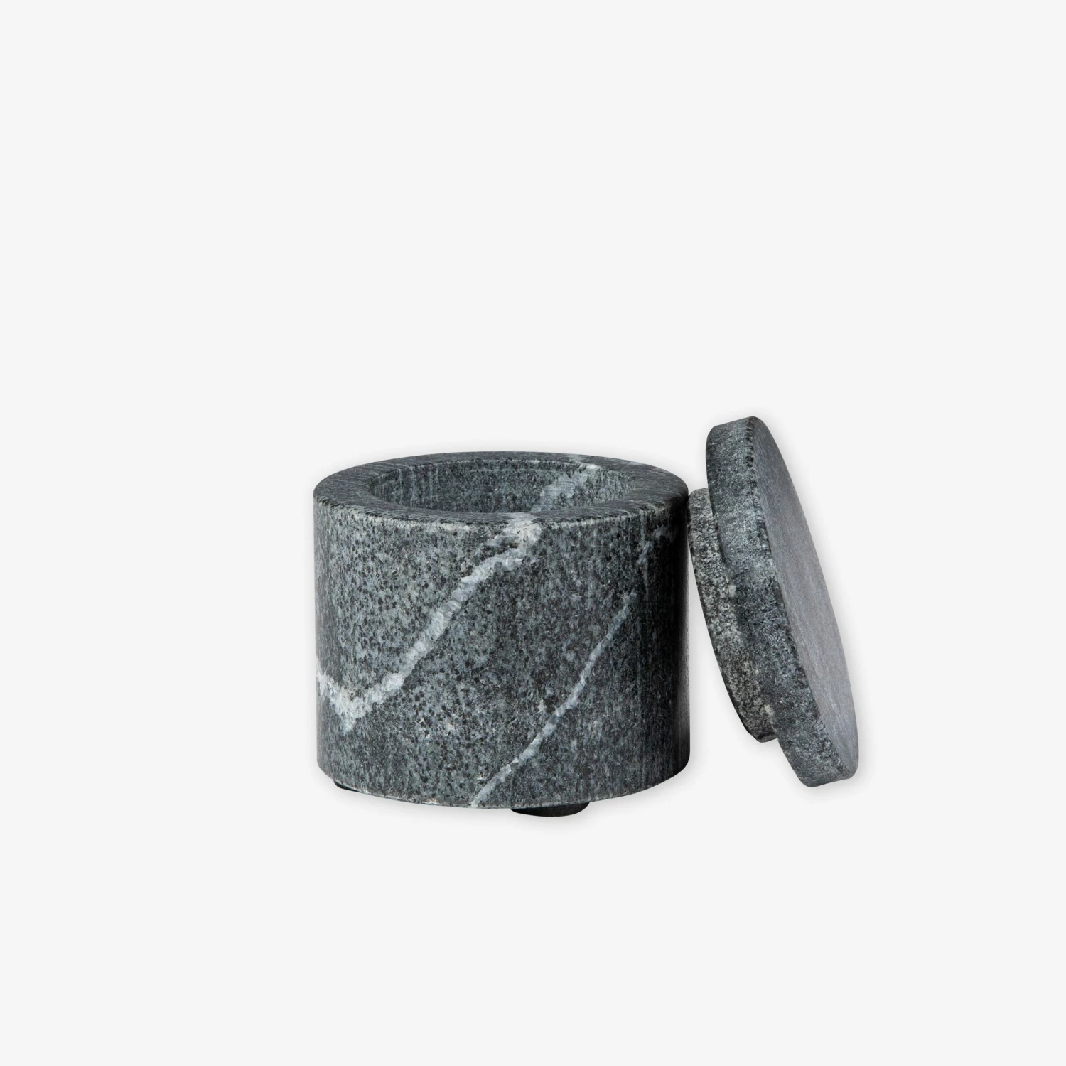 Stilvolles und ästhetisches Aufbewahrungsgefäß mit Deckel zur Aufbewahrung von kleinen Schmuckstücken. Verwende es im Badezimmer für Wattepads, Haarbänder und mehr. Oder warum nicht für Schmuck? Die Schachtel ist in zwei Größen erhältlich und gehört zu einer Kollektion aus dunkelgrauem Marmor. Marmor ist ein natürliches Material, das sowohl in der Farbe als auch in der Form variieren kann – kein Produkt gleicht dem anderen.Maße: H 6 cm Ø 7 cm.