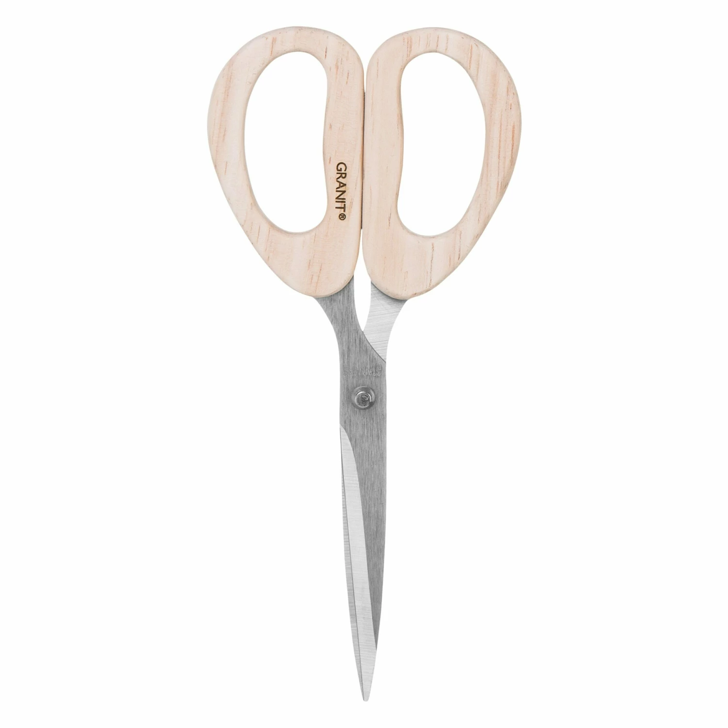 Praktische und schöne Schere mit Griffen aus unbehandeltem Kautschukholz.