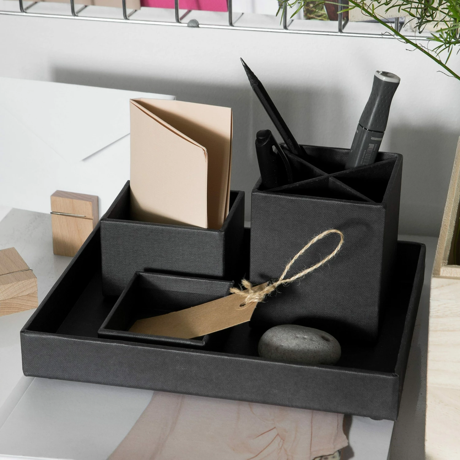 Der clevere Organizer im Farbton Graphit bringt Ordnung in dein Büro und auf deinen Schreibtisch. Er wurde in Europa aus umweltfreundlichem recycelten Karton hergestellt. Eine übersichtliche Aufbewahrung von Büro- und Schreibutensilien macht das Arbeiten leichter. In den 4 Ablagekästchen finden Stifte, Schere, Radiergummi und Notizblock Platz.