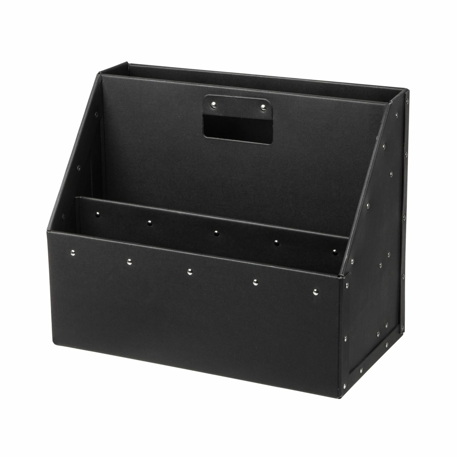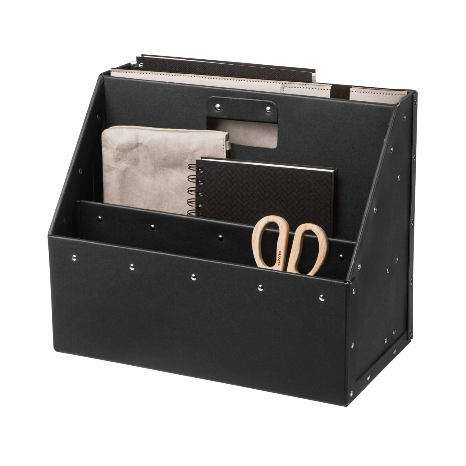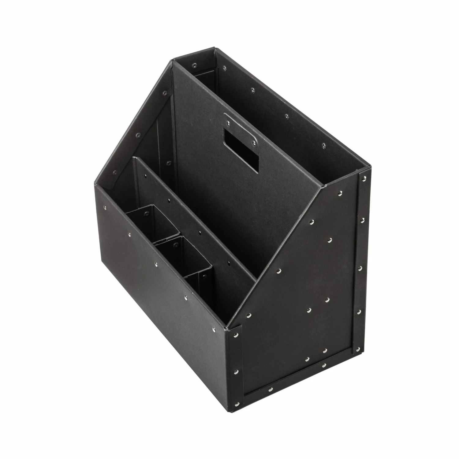 Tragbarer Schreibtisch-Organizer aus starker, handvernieteter Pappe, den du mit Stiften, Lineal, Schere, Tacker etc. füllen kannst. Ausgestattet mit einem Griff, lässt sich das Set einfach und handlich zum Workshop oder zum Meeting mitbringen oder Zuhause ins andere Zimmer tragen.