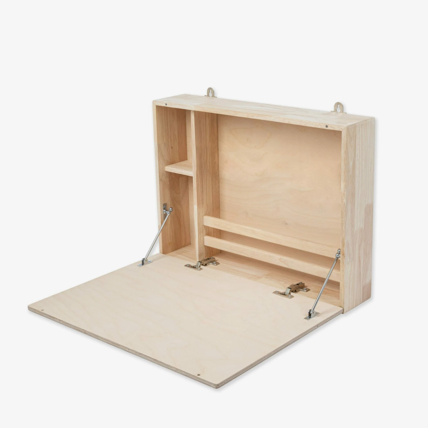 | Mit einem an der Wand montierten Schreibtisch sparst du viel Platz. Ein kleinerer, an der Wand montierter Schreibtisch ist perfekt für alle, die einen kleinen Wohnraum haben, aber dennoch einen praktischen Arbeitsbereich gestalten möchten. Nach getaner Arbeit schließt du einfach den Deckel, um den Inhalt zu verbergen. Unser Wandschreibtisch ist aus Kautschukholz und Birkensperrholz gefertigt. Dank der stabilen Haken auf der Rückseite lässt er sich leicht aufhängen. Im Inneren gibt es vier verschiedenen Fächer mit Stauraum für die Kleinigkeiten, die du immer griffbereit haben möchtest. Maße: H 43 B 58,2 T 12,8 cm. Maximale Belastung: 15 kg. |