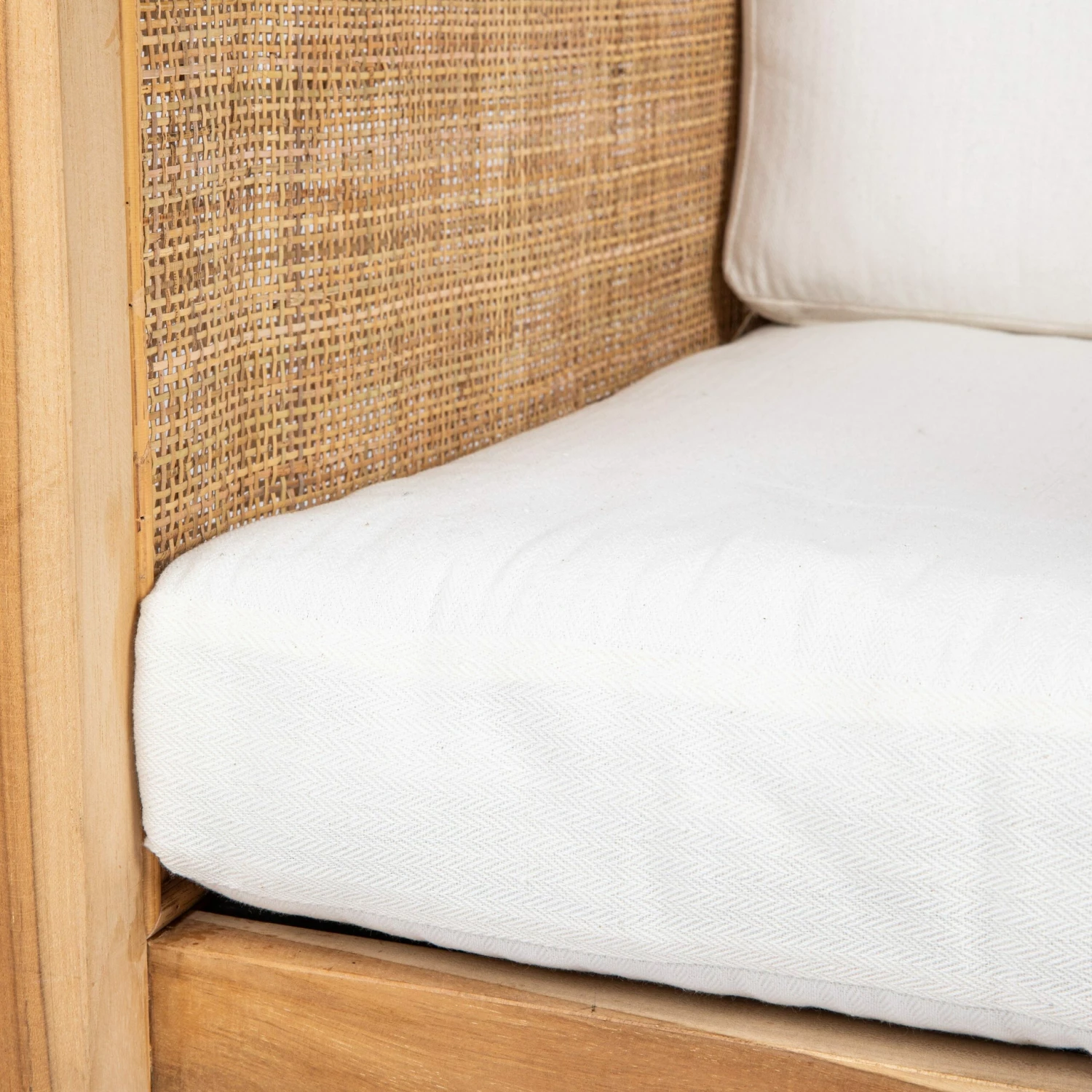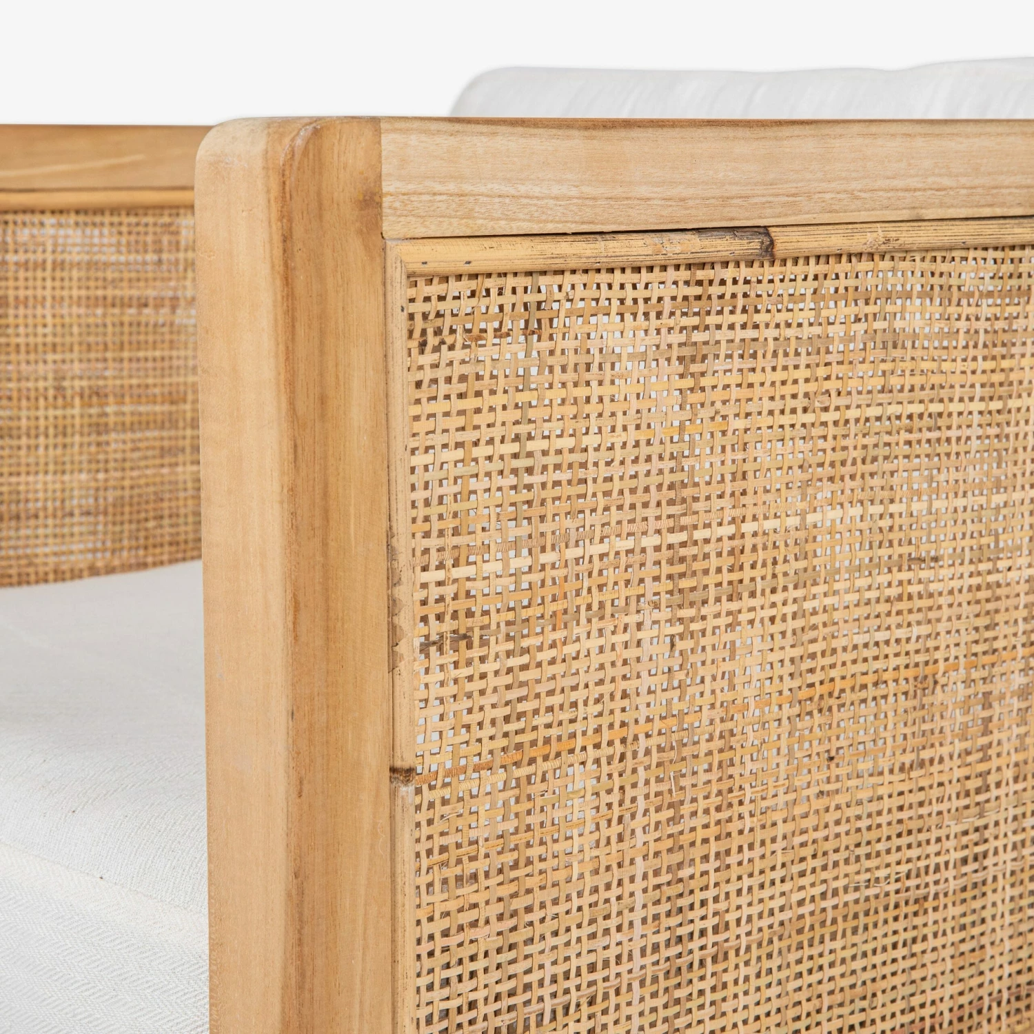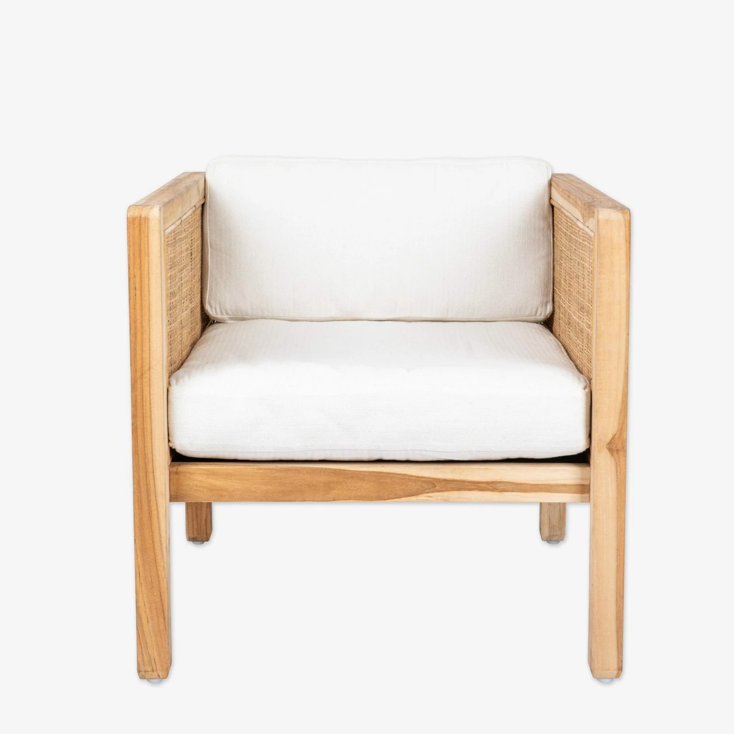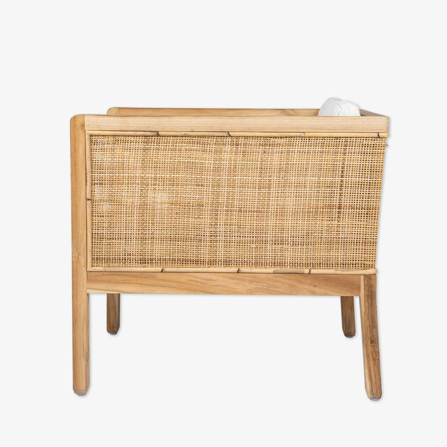 Schöner und stilvoller Sessel aus Teakholz und Rattan mit einem passenden weißen Kissen. Funktioniert sowohl im Wohnzimmer als auch im Schlafzimmer. Nur zur Verwendung in Innenräumen. Höchstgewicht: 120 kg.