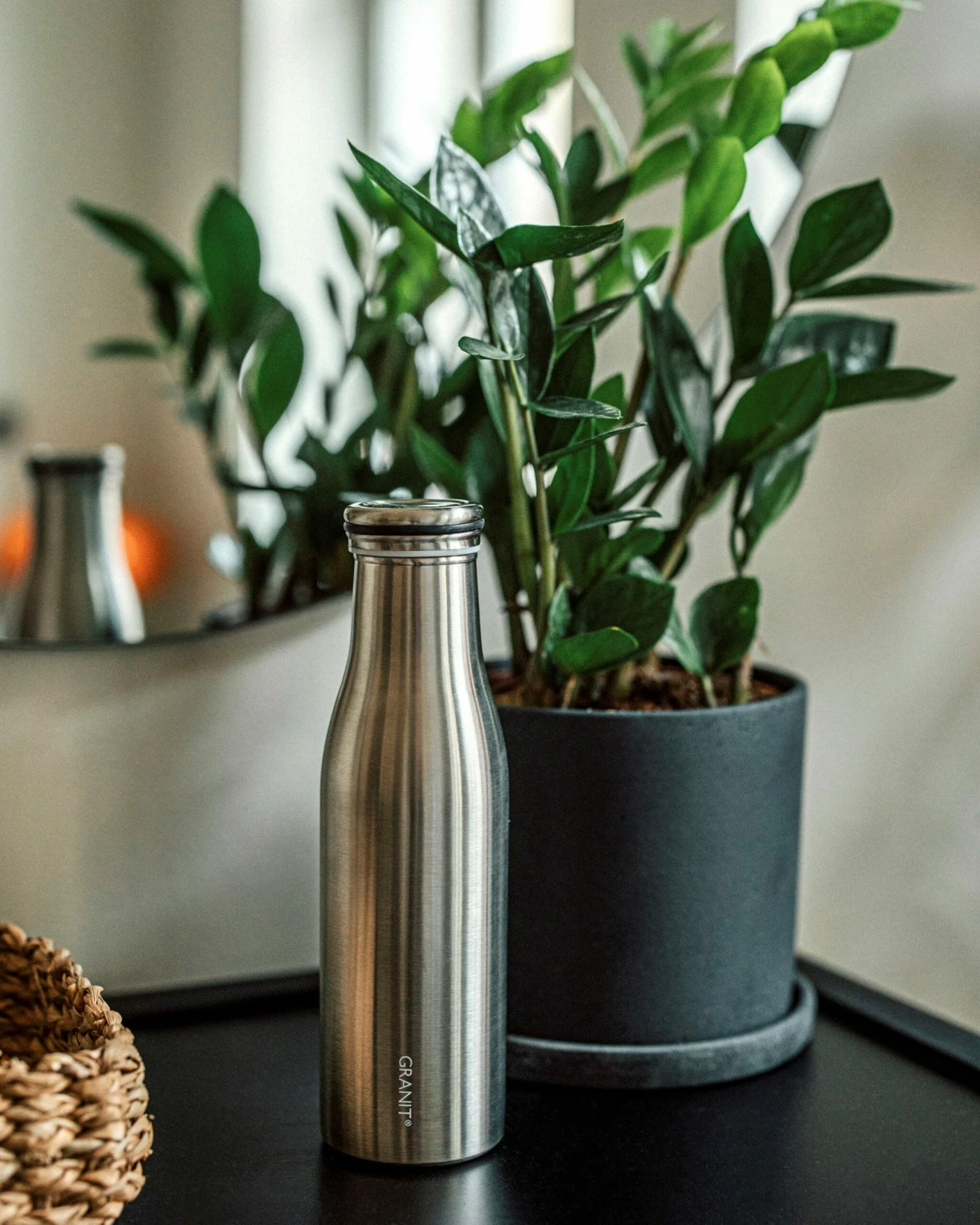 Thermosflasche aus Edelstahl mit Doppelwänden und Vakuumeffekt. Die Flasche hält dein Getränk lange Zeit kühl oder warm.