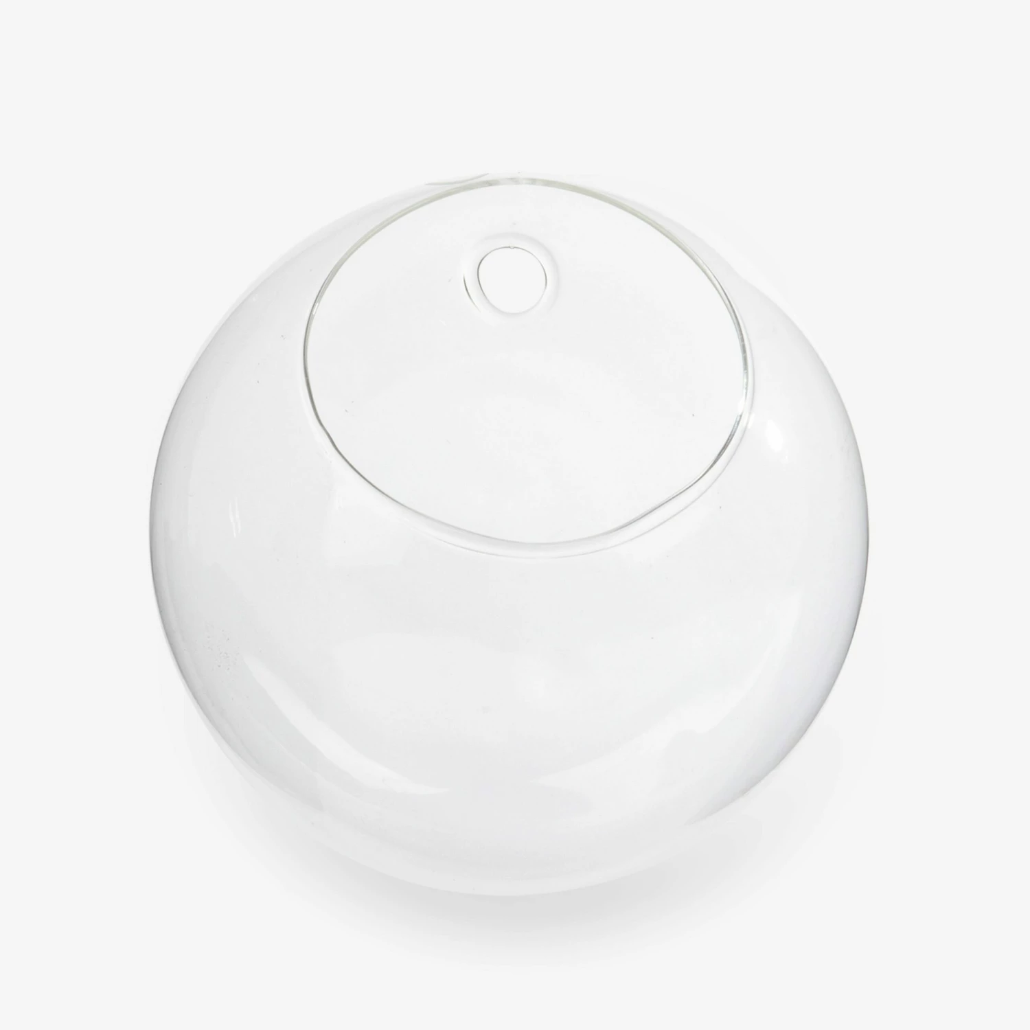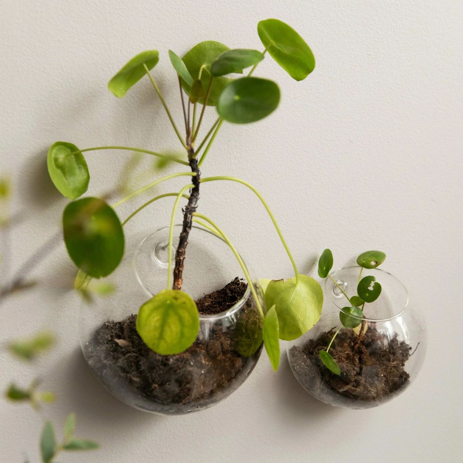 An der Wand befestigte Vase oder kleiner Glasblumentopf. Die Vase hat ein Loch, mit dem sie an die Wand gehängt werden kann.