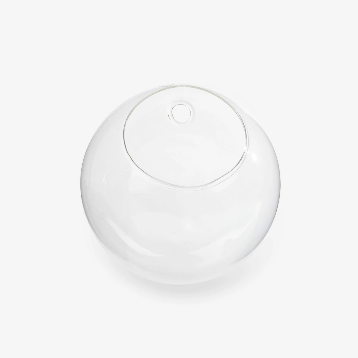 An der Wand befestigte Vase oder kleiner Glasblumentopf. Die Vase hat ein Loch, mit dem sie an die Wand gehängt werden kann.